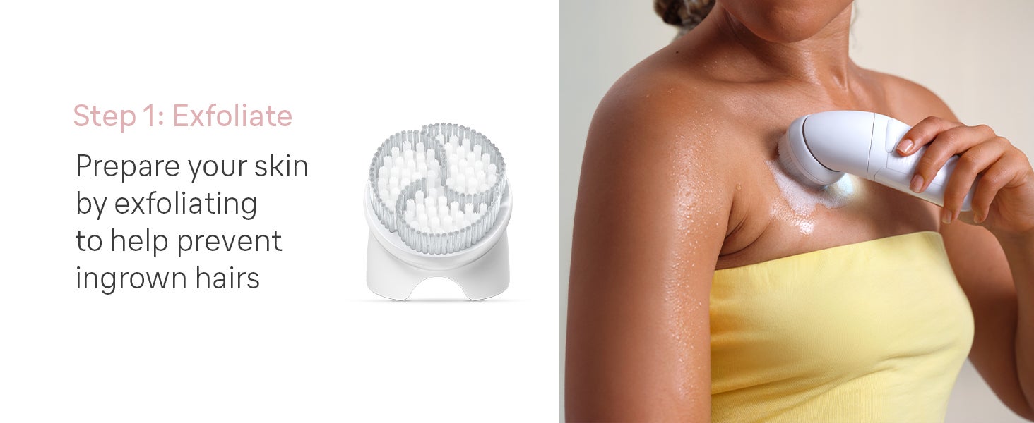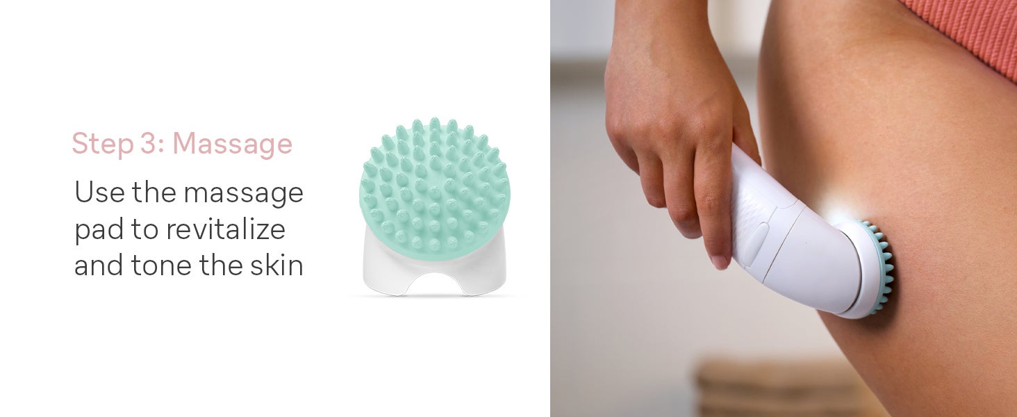 HEAD-TO-TOE SMOOTHNESS: Easy 3-step routine for radiant skin. Includes a massage pad, an exfoliation brush and a lady shaver head.