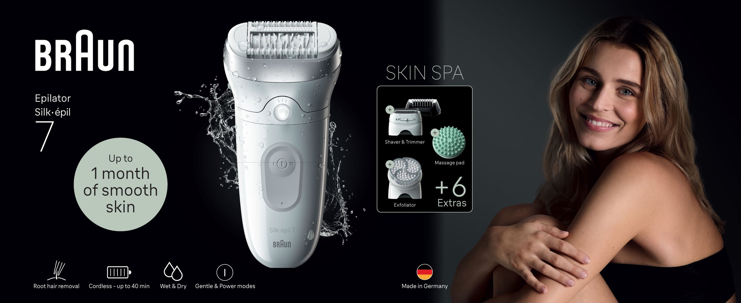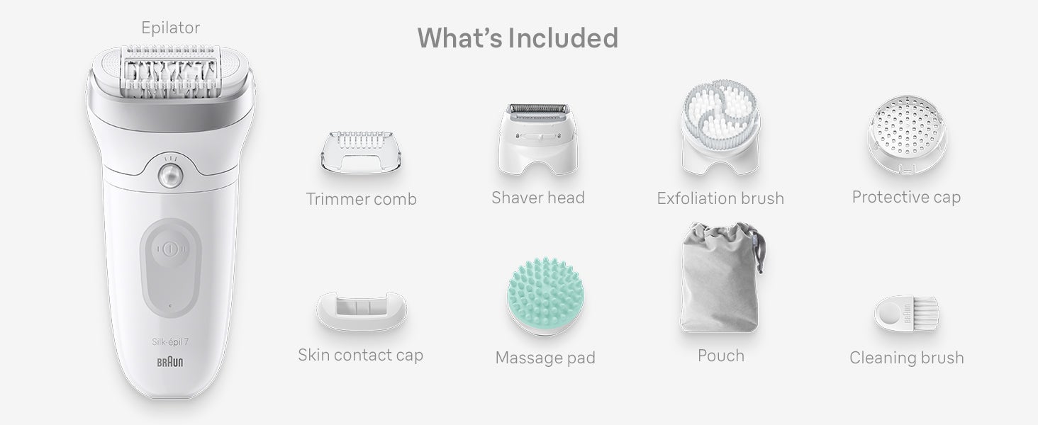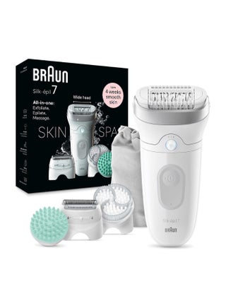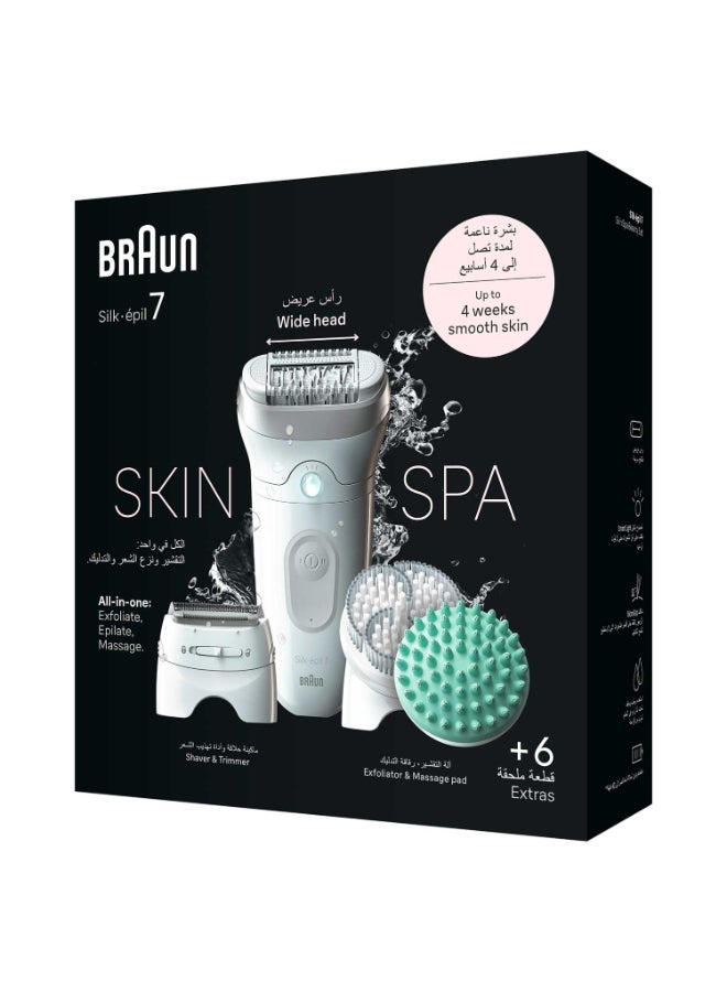 Silk-epil 7 SkinSpa 7-081 Epilator Wet & Dry, Deep body exfoliation brush, Pouch. + 6 Extra White