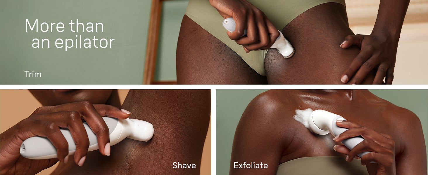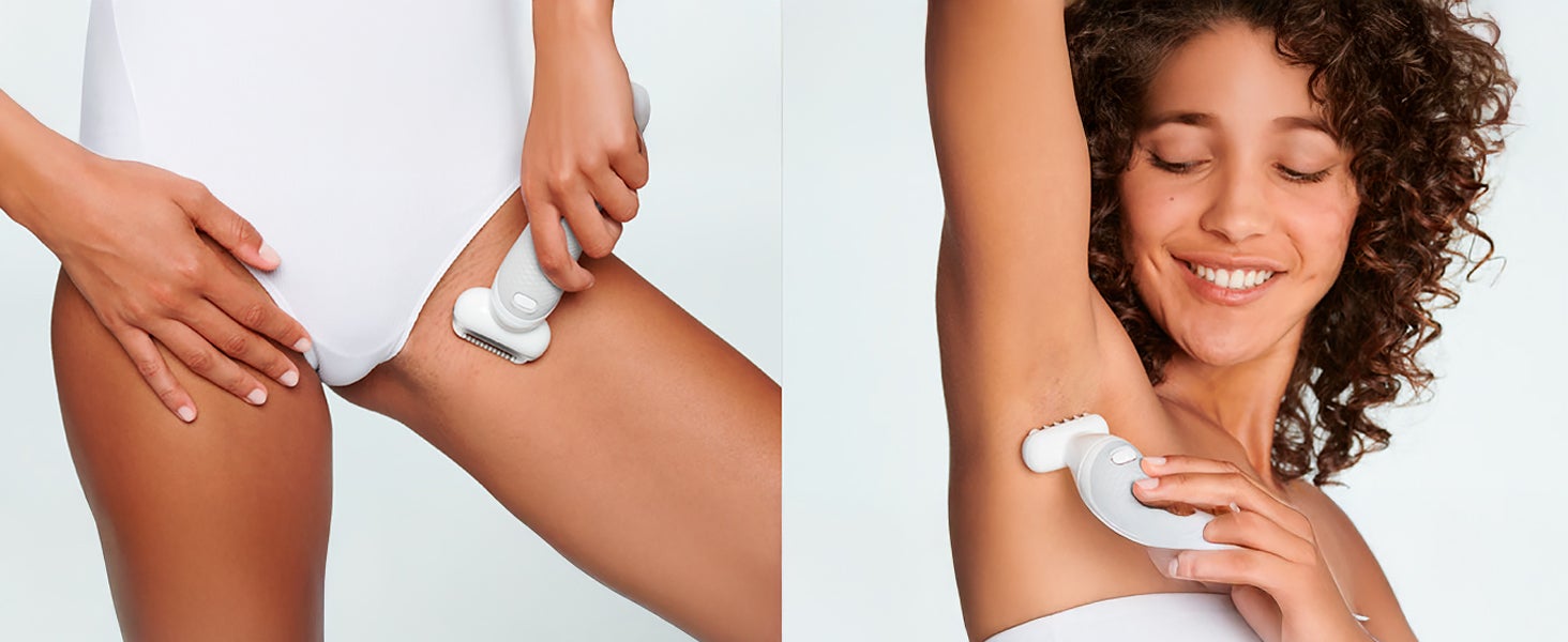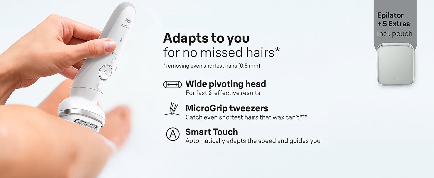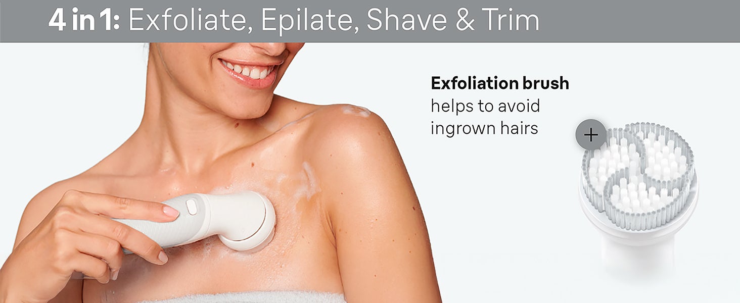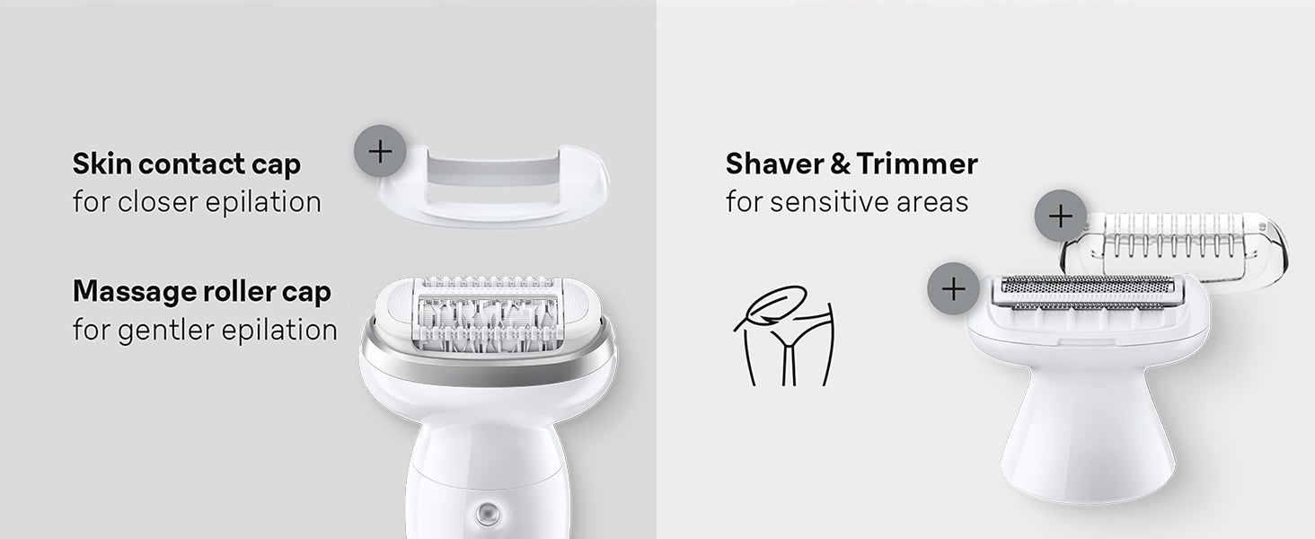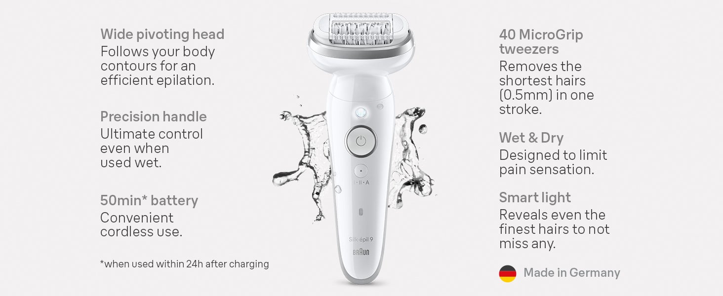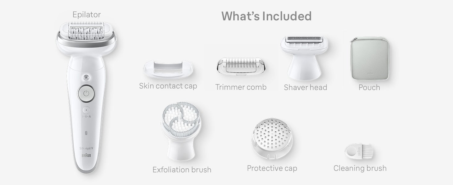 | What's In The Box | Silk-épil 9 epilator,Shaver head,Trimmer cap,Skin contact cap,Body exfoliation brush,Protective cap,Cleaning brush,Smart plug and Pouch |