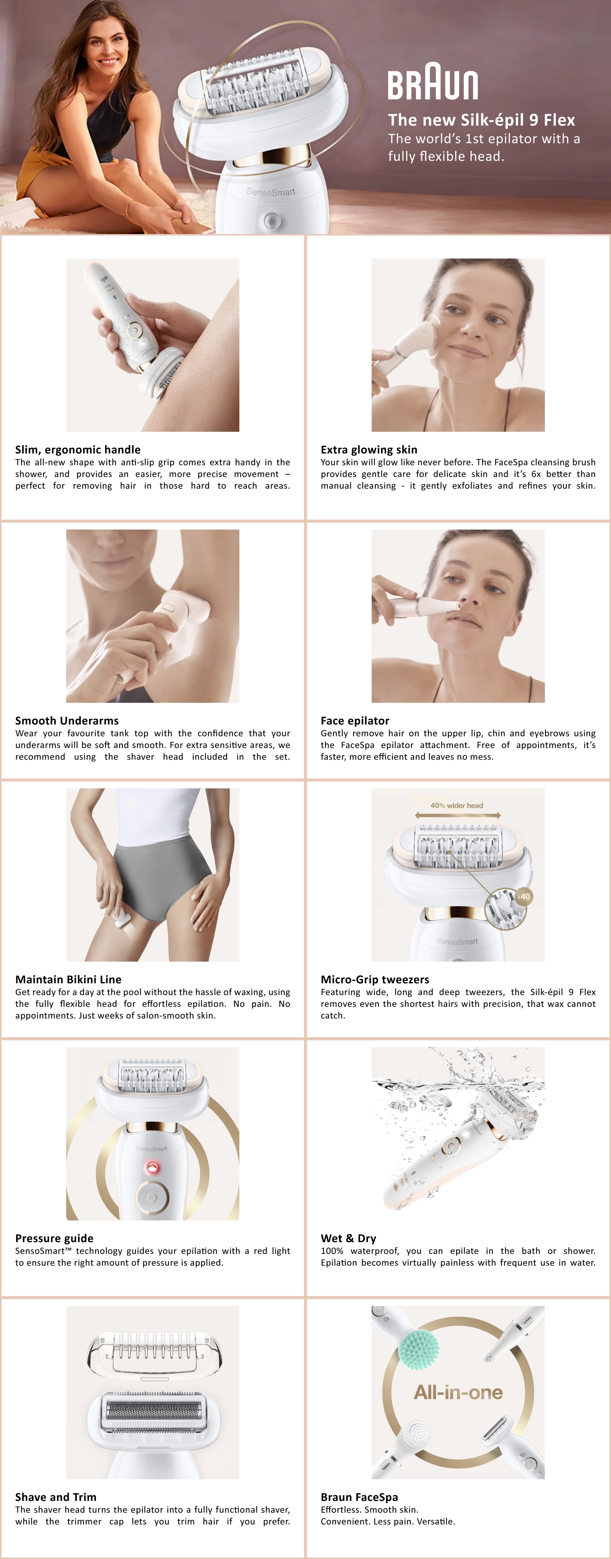 | What's In The Box | 1x Braun Silk epil 9300 3D, 1x FaceSpa Epilator,, 1x Shaver Cap, 1x Shaver Head, 1x FaceSpa Massage Pad, 1x FaceSpa Cleansing Brush, 1x Facial Cap, 1x Trimmer Cap |