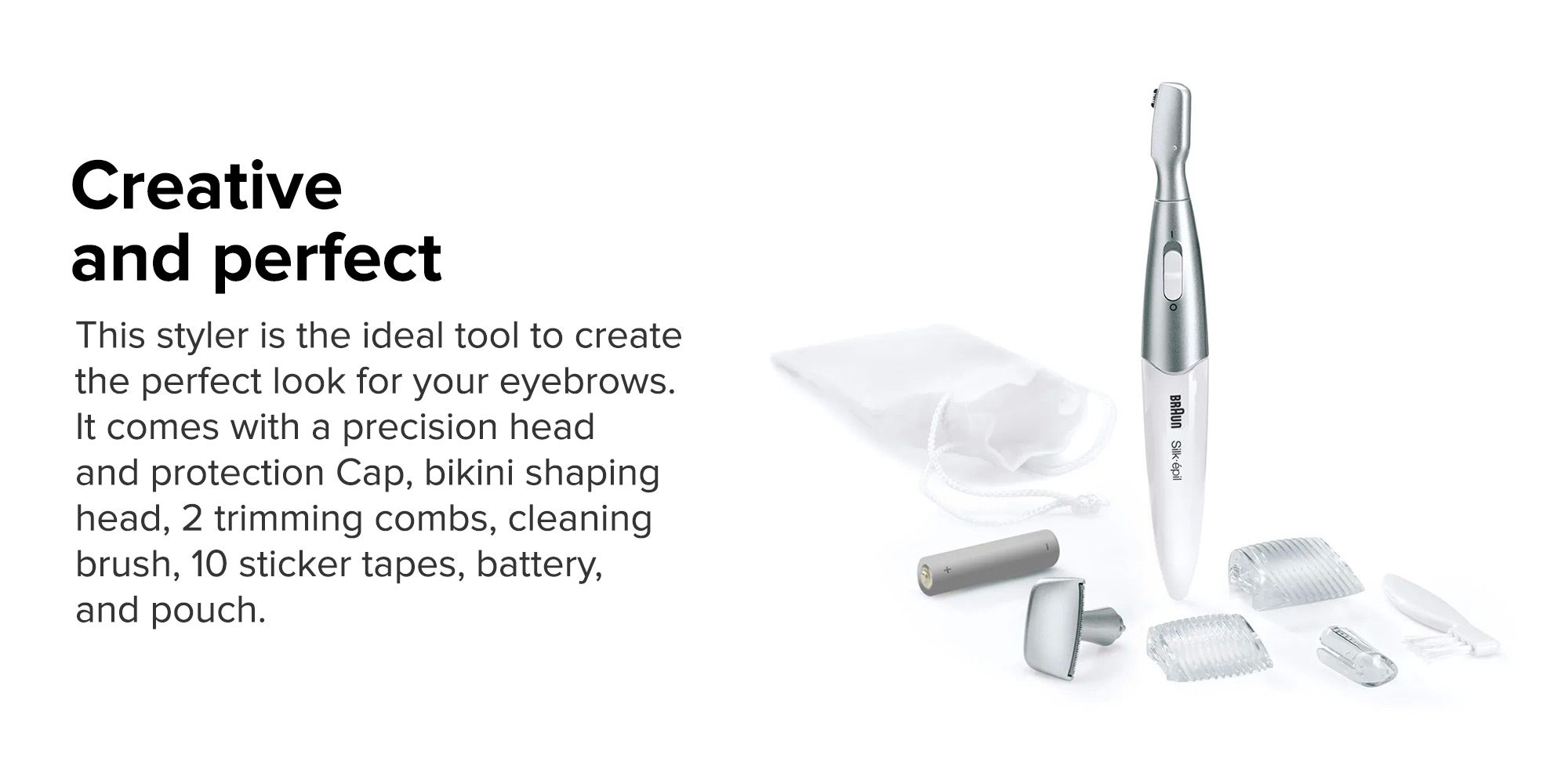 Precision Head with Protection Cap, Bikini Shaping Head, 2 Trimming Combs, Cleaning Brush, 10 Sticker Tapes, Battery, Pouch
