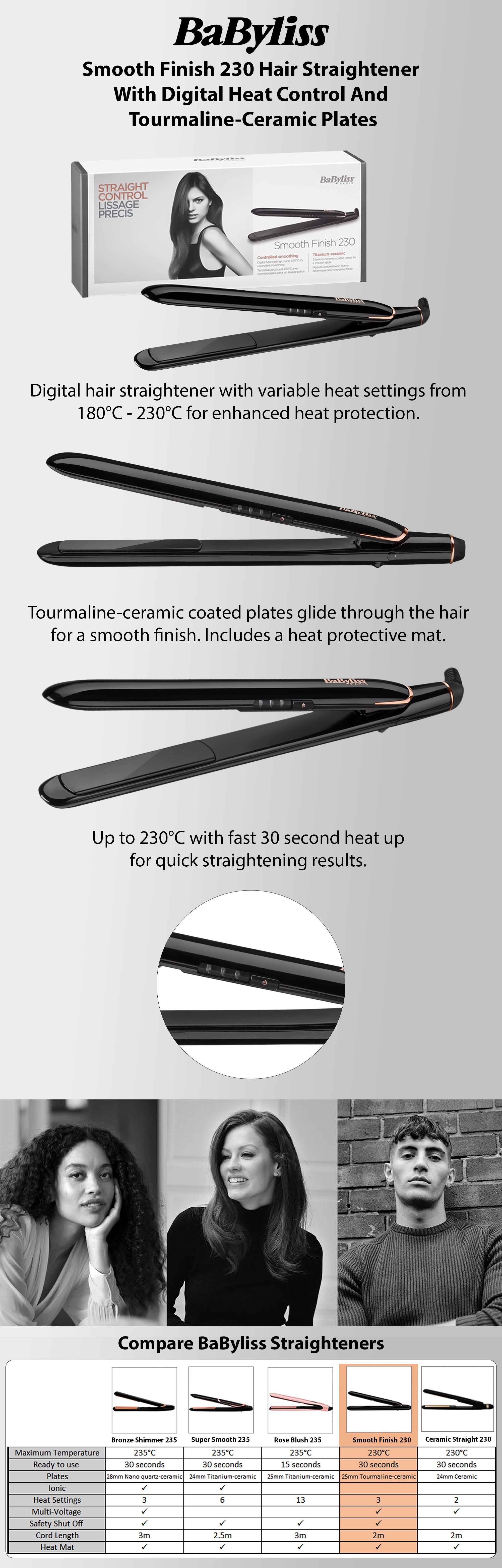 BaByliss ST250SDE Smooth Finish 230 Hair Straightener 25 Mm Ptc 3Temps Black Up To 230C Titanium Ceramic Heat Mat - ST250SDE. Fast Heat Up. Titanium-Ceramic Coated Plates, Auto Shut Off. 3 Digital Heat Settings 180C -230C, Multi-Voltage. 2M Swivel Cord. Heat Mat. The BaByliss Smooth Finish 230 Hair Straightener ST250SDE is a high-quality hair straightener that delivers salon-like results.