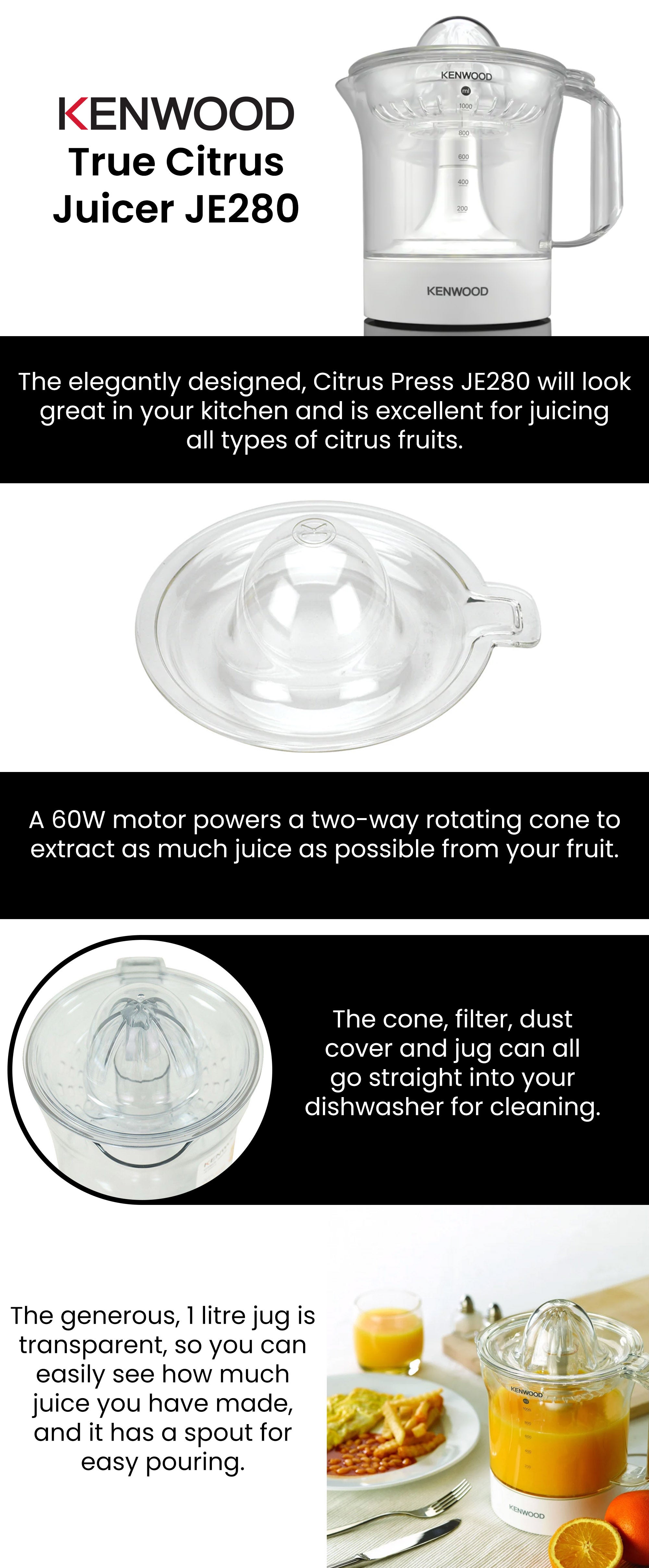 A 60W motor powers a two-way rotating cone to extract as much juice as possible from your fruit. The generous, 1 litre jug is transparent, so you can easily see how much juice you have made, and it has a spout for easy pouring. When you're done, the cone, filter, dust cover and jug can all go straight into your dishwasher for cleaning.