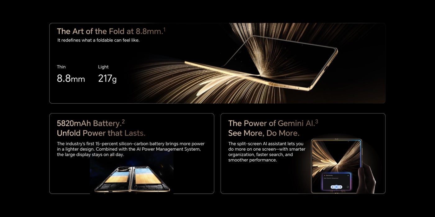مدعوم بمعالج Snapdragon 8 Elite الثوري بتقنية 3 نانومتر، يوفر سرعة استجابة بمستوى الهواتف الرائدة مع سعة تخزين تصل إلى 512 جيجابايت وذاكرة RAM بسعة 16 جيجابايت. سواء كنت تقوم بمهام متعددة، أو تلعب، أو تعدل أثناء التنقل، فإن هذا الهاتف القابل للطي يواكبك — ويقود.