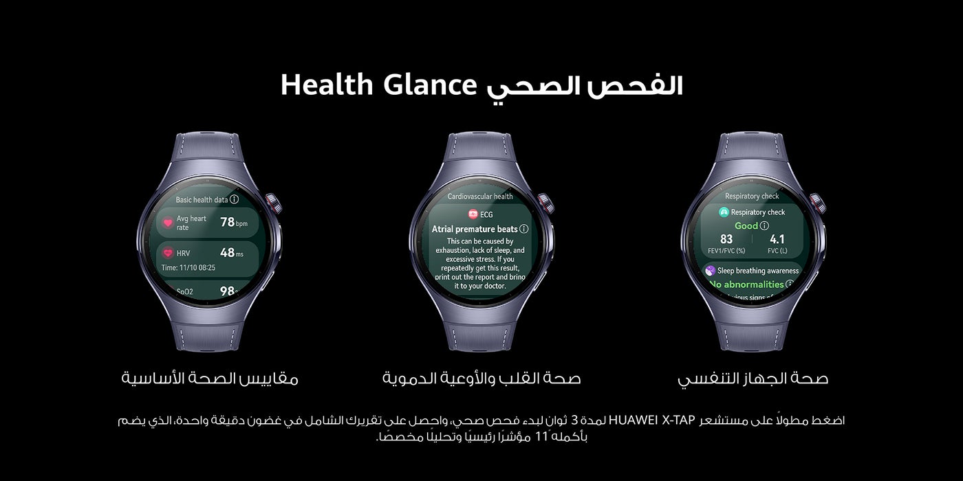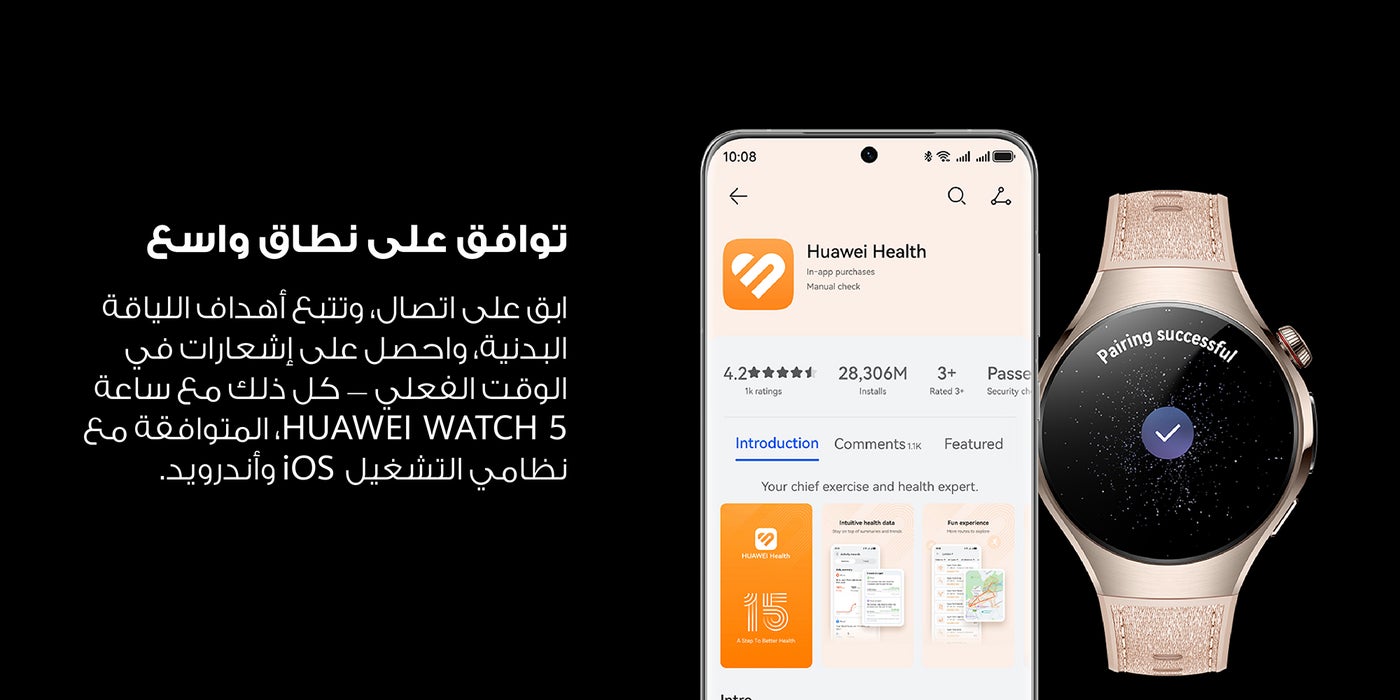 | محتويات العلبة | HUAWEI WATCH 5, Wireless charging cradle and cable, Quick Start Guide, Safety Information, and Warranty Card |