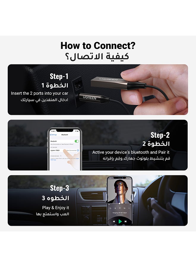 جهاز استقبال للسيارة من يوجرين بتقنية البلوتوث مع صوت عالي الجودة حول نظام الصوت في منزلك أو سيارتك إلى تقنية بلوتوث لاسلكية، وهو أصغر جهاز استقبال للموسيقى في العالم، وقم ببث موسيقى عالية الجودة ونقية من هاتفك الذكي أو جهازك اللوحي. تحدث بوضوح منتج يتيح إمكانية إجراء المكالمات بدون استخدام اليدين بفضل الميكروفون المدمج الذي يجعل التحدث مع الأصدقاء أمراً سهلاً. دليل التشغيل 1. قم بتوصيل منفذ الصوت بمقبس AUX مقاس 3.5 مم. 2. قم بتوصيل منفذ الطاقة بمقبس USB. 3. قم بتشغيل البلوتوث في هاتفك الخلوي، ثم اضغط للاقتران، مما يتيح لك الاستمتاع بالموسيقى لاسلكياً.
