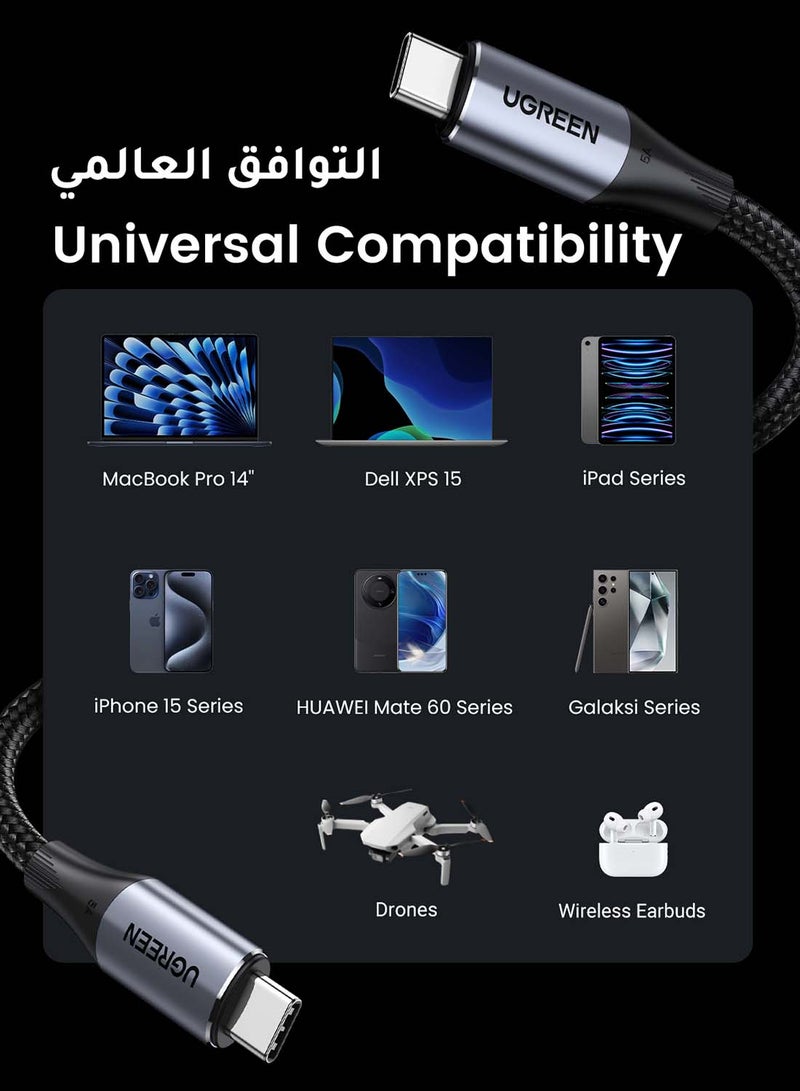 【توافق واسع النطاق】: كيبل USB-C من يوجرين متوافق مع كافة الأجهزة من النوع C مثل ايباد ميني 6، ماك بوك برو 2021 بشاشة 14، 16/13 15 بوصة، ماك بوك اير الجديد، ماك بوك ريتينا، ماك ميني، جوجل كروم بكسل، ديل XPS 13/15 بوصة، سيرفيس برو 7، ايباد برو 2021 2020 بشاشة 12.9*11 بوصة، هواوي P60، ميت 10، سامسونج S23 الترا، نوت 20، A70، شاومي مي 11، اتش تي سي U11 10، ون بلس 5T، 6، إلخ. 【محتويات العبوة】: 1 × كيبل USB-C إلى USB-C و1 × دليل المستخدم (توفره باللغة العربية غير مؤكد)