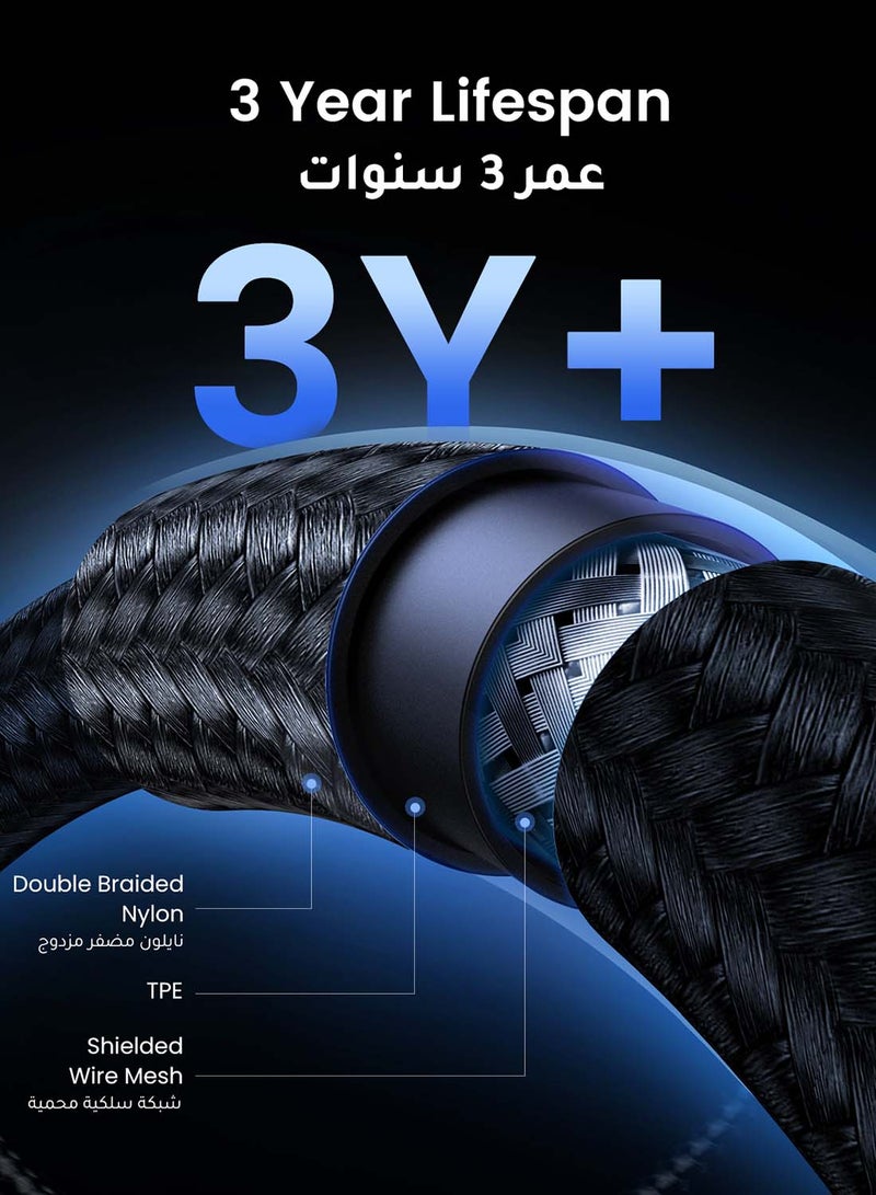 【جودة عالية】: يضمن الكيبل المضفر المغطى بالنايلون الصلب والمتين عمر خدمة أطول يصل إلى 10000 مرة ثني. صُيمت موصلات USB-C مزدوجة الجوانب مع تخفيف الضغط المفرط من أجل الإدخال المتكرر.