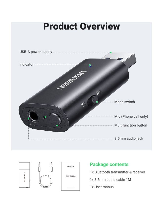 【استمتع بحرية دون أسلاك】يمكن لجهاز الإرسال والاستقبال الصوتي المزود بتقنية بلوتوث 5.1 من يوجرين إضافة خاصية البلوتوث إلى جهاز التلفزيون أو الكمبيوتر أو السيارة، وإقامة اتصال لاسلكي ونقل الصوت بين جهاز الكمبيوتر أو التلفزيون.
