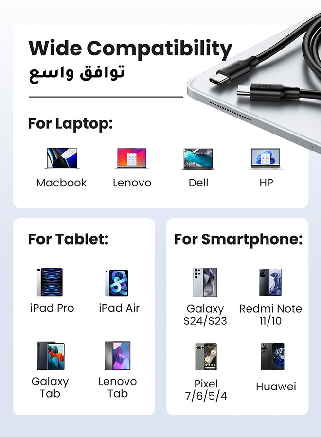 【توافق عالمي】يتوافق كابل USB C إلى USB C مع جميع شاحن PD USB C ومتوافق مع جميع أجهزة USB c وكاميرا الكمبيوتر المحمول مثل iPhone 15/15 Plus/15 Pro/15 Pro Max وSamsung Galaxy وNote وiPad Air وMini ، برو، ماك بوك برو، إير، هواوي، مايكروسوفت، ديل، إلخ.