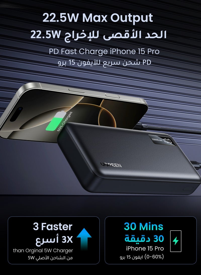 【شحن سريع بقوة 22.5 واط】مقارنةً ببنوك الطاقة التقليدية، تتمتع بنوك الطاقة يوجرين بتقنية شحن سريع مطورة. يسمح مدخل منفذ USB C بقوة 20 واط بشحن بنك الطاقة المحمول الخاص بك بالكامل بشكل أسرع، كما يسمح خرج 22.5 واط بشحن جهازك بشكل أسرع من الأجهزة الأخرى.