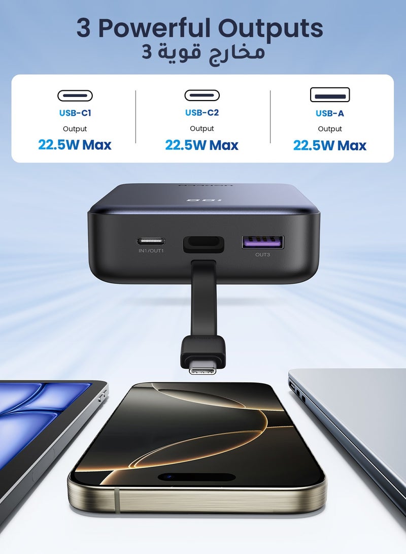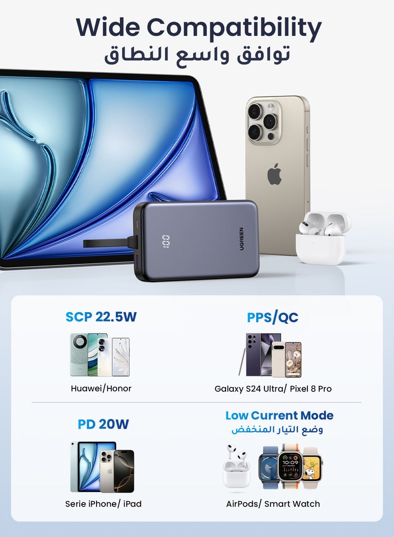 Fast Charing - The UGREEN Battery Pack Supports Max 22.5W fast charging. Effectively improve the charging efficiency and reduce the time you hold the power bank