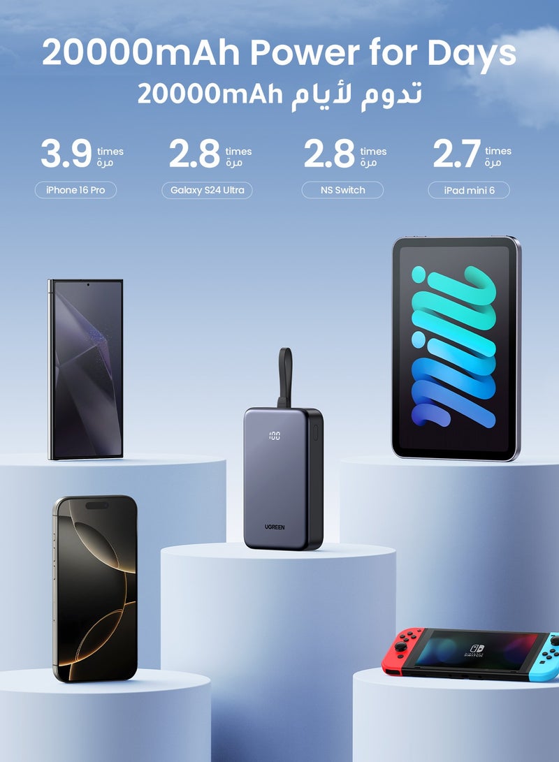 20000mAh Large Capacity - The UGREEN Power Bank with 20000 mAh capacity, supports charging 3 Devices at the same time. Only one power bank is needed when you go out, your iPhone, tablet, smartwatch, and NS can be charged at one time