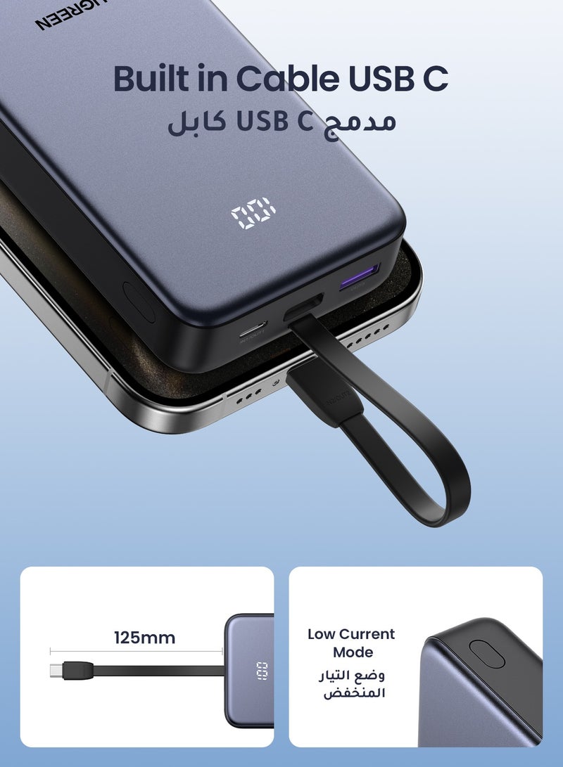 USB Type C Cable Built-in - Compared with a traditional portable charger, this UGREEN power bank has a built-in USB Type C fast charging cable. You no longer need to bring extra cables when you go out. It will save you time and effort