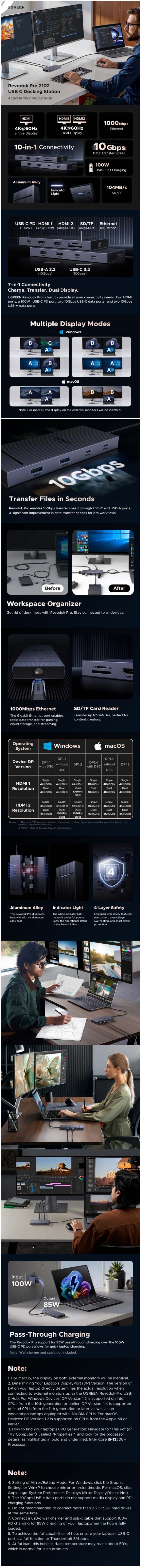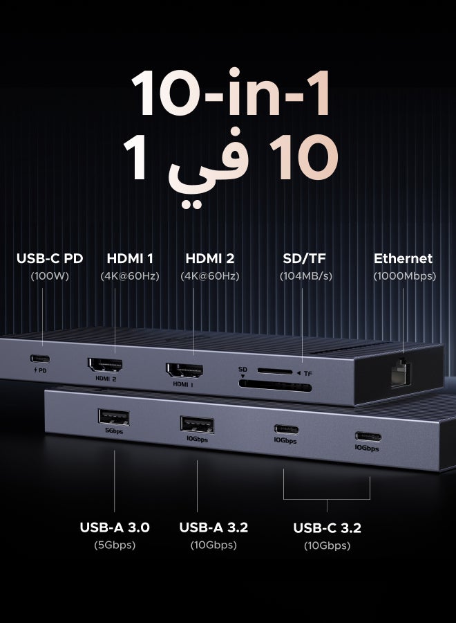موزع USB C ريفودوك، 10 في 1، منفذان 4K@60Hz HDMI، قاعدة توصيل للعرض، شحن سريع 100 وات، موزع شبكة 1000 ميجابت في الثانية، USB A 3.0+USB A 3.2+2USB C 3.2، نقل بيانات 10 جيجابت في الثانية، قارئ بطاقات