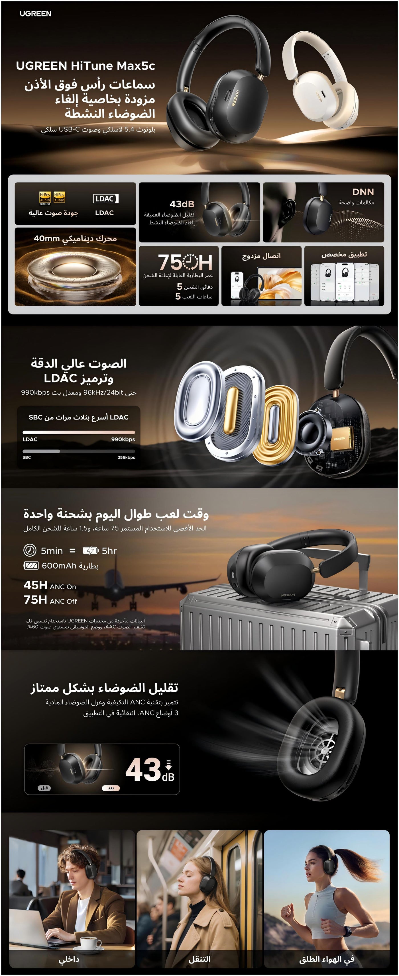 | محتويات العلبة | UGREEN Bluetooth Headphones over ear*1, USB C to USB C audio cable*1, USB C to USB A charging cable, user manual*1, 24-month warranty |