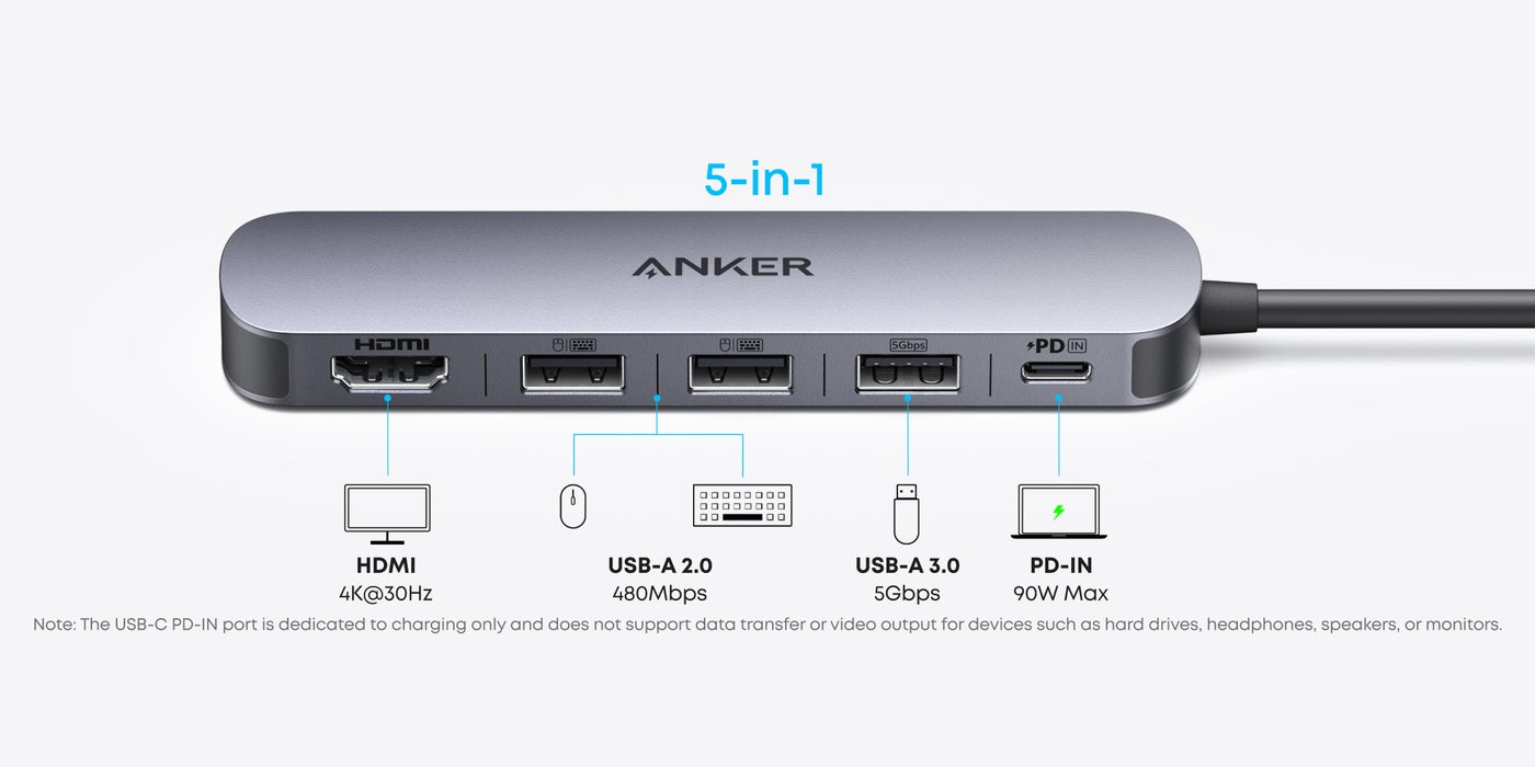 5-in-1 USB-C Hub: Experience comprehensive connectivity featuring a Power Delivery input, two USB-A 2.0 ports, a USB-A 3.0 port, and an HDMI port. (Note: The USB-C power delivery input port is only for connecting an external wall charger to power your laptop and cannot power peripheral devices.)