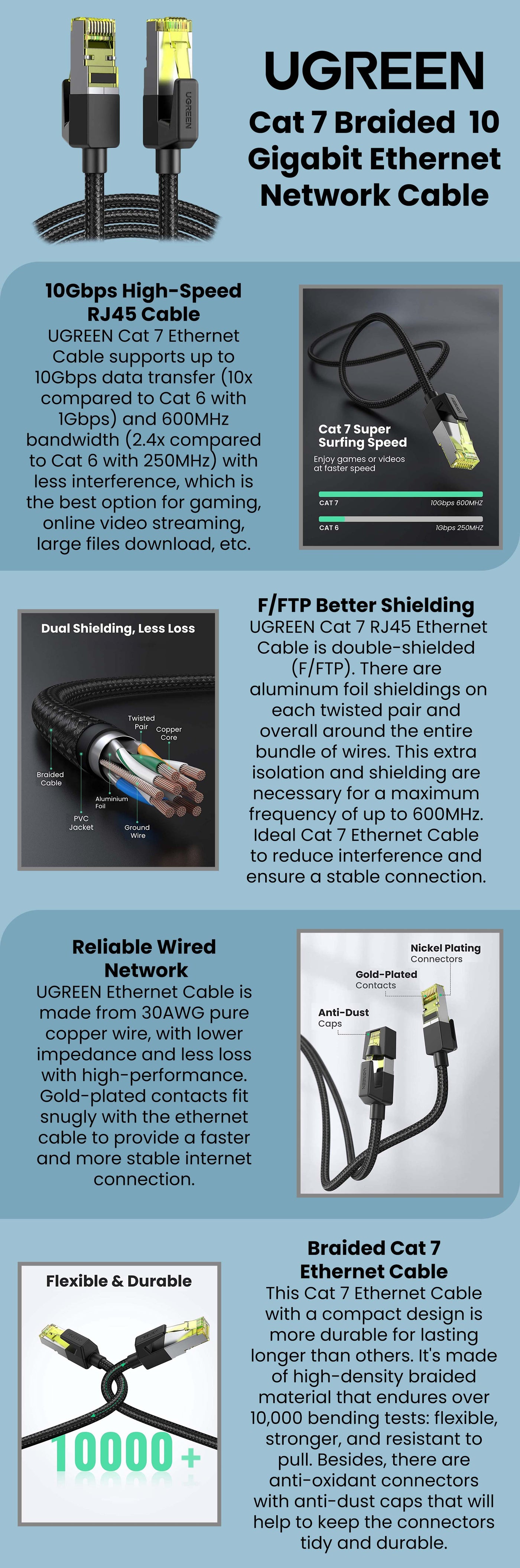 UGREEN Cat7 Braided Ethernet cable supports 600MHz bandwidth to connect to LAN, WAN and network devices at maximum speed., server application, online gaming, online video streaming etc. You could enjoy a super fast ethernet speed whether at home or office