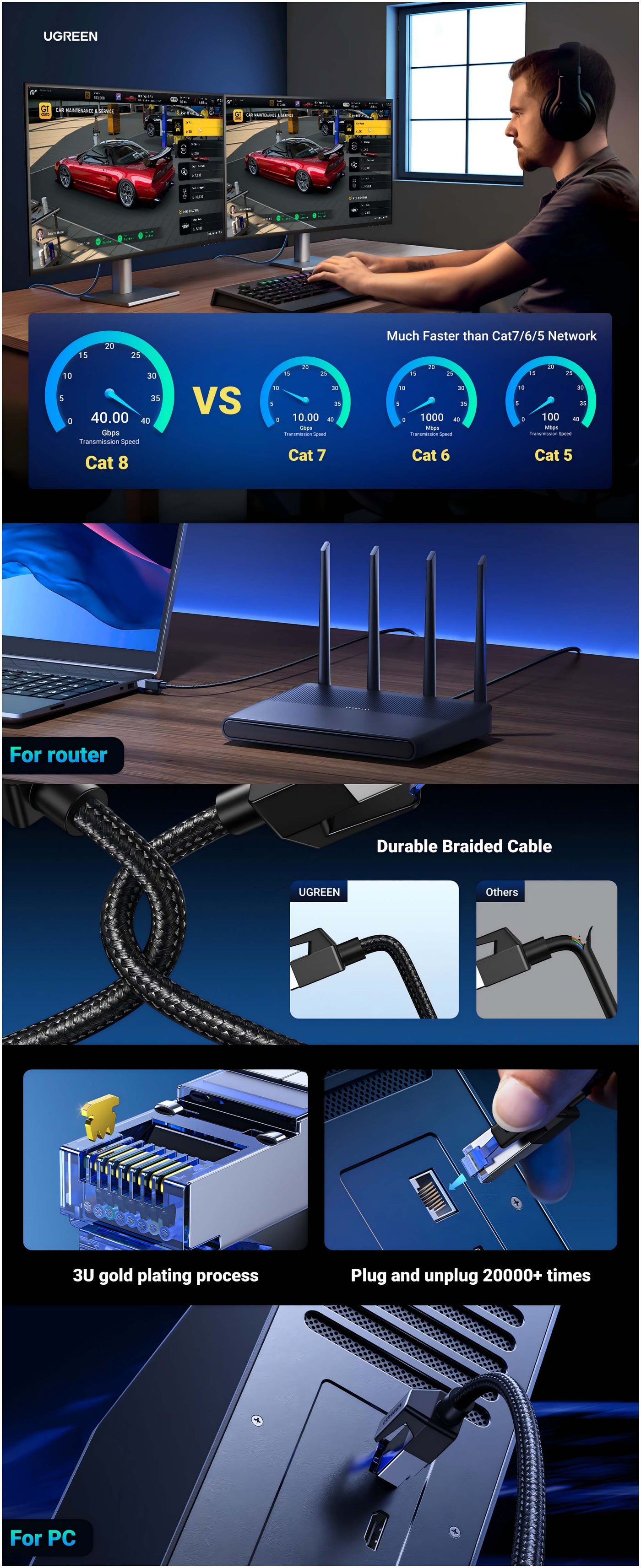 【40Gbps High Speed】UGREEN Cat 8 network cable supports up to 40Gbps data transfer and 2000MHz bandwidth without dropout.