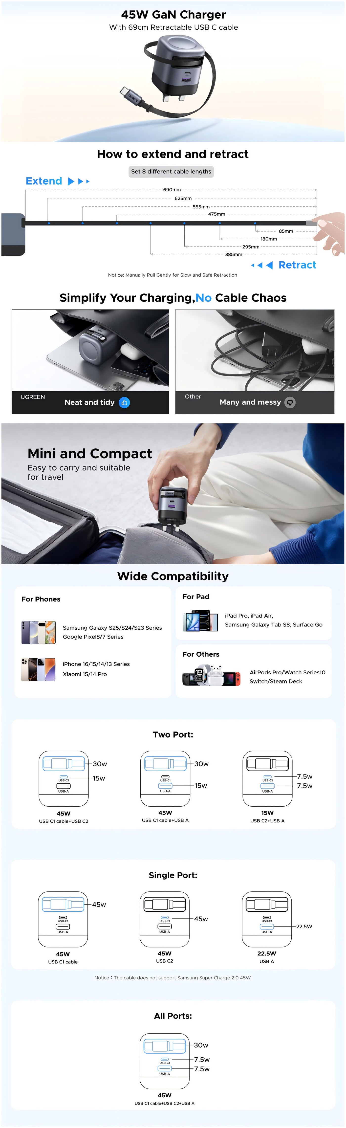 | What's In The Box | 1× UGREEN 45W retractable Fast charger, 1× user manual |