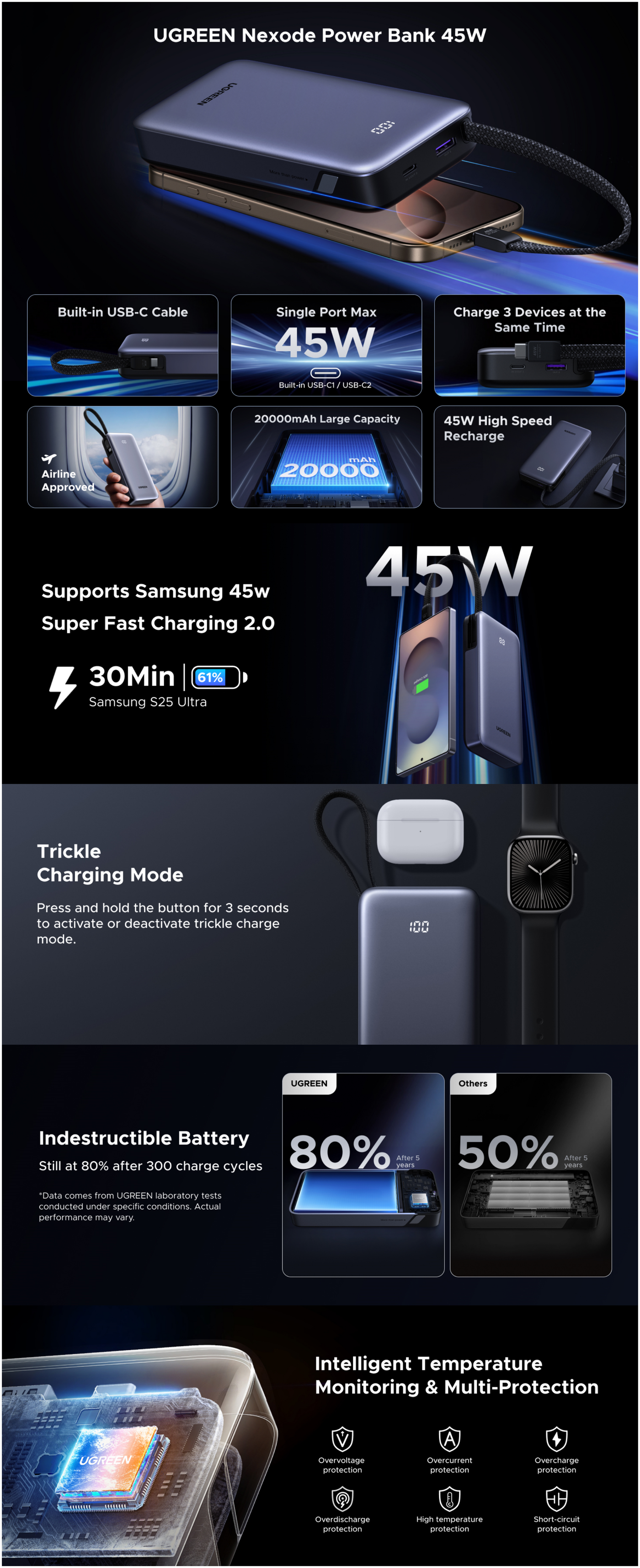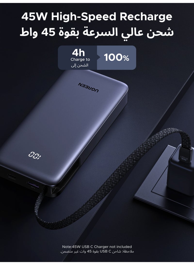 45W High-Speed Power: Experience rapid charging with 45W max output. This powerful portable charger can quickly refill your smartphone, tablet, or even a laptop, significantly cutting down waiting times.