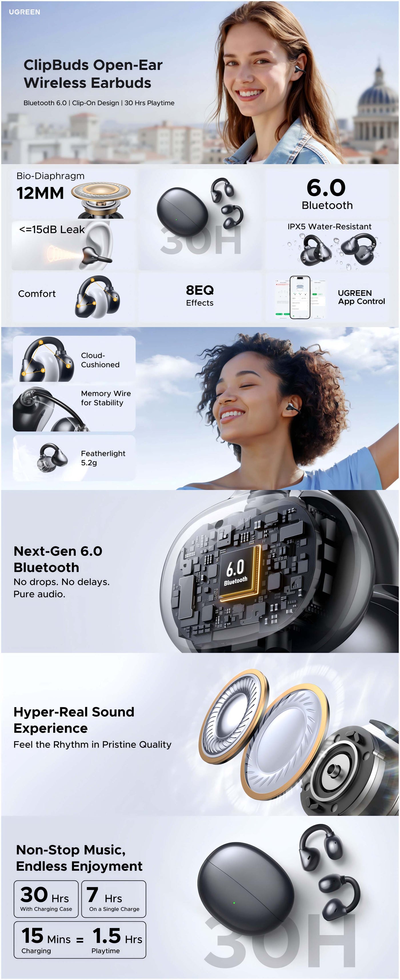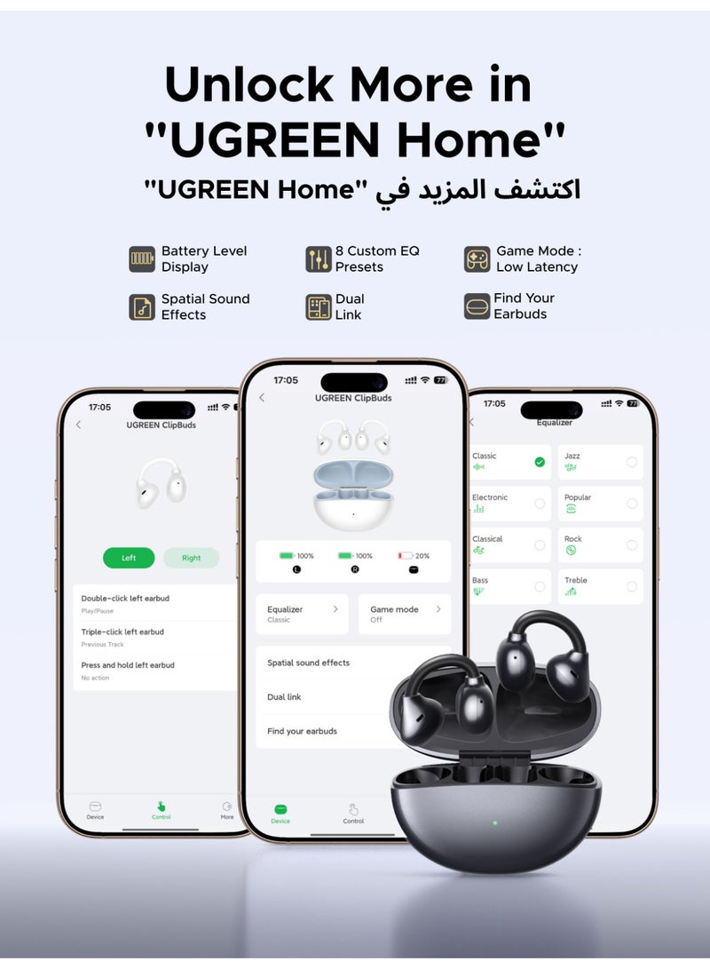 UGREEN ClipBuds redefine open-ear audio with a focus on comfort and innovation. Their ergonomic clip design ensures a secure, weightless fit for all-day wear.