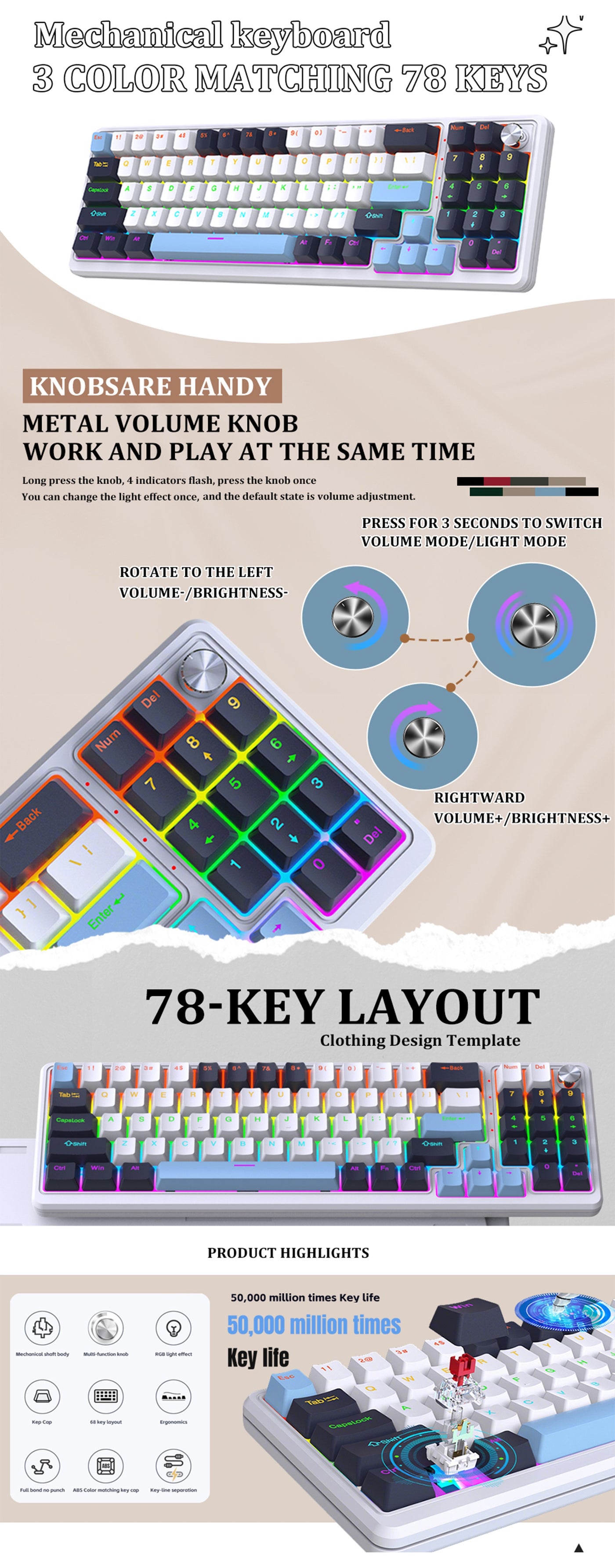 This 78-key mechanical keyboard is designed for gamers and high-efficiency office workers. It features waterproof and dustproof blue mechanical keys that can withstand liquid splashes and dust, providing a durable, stable, pure touch and precise feedback. The stunning RGB backlighting supports six customizable gaming modes, paired with transparent characters and dual-color keycaps that are both durable and corrosion-resistant. This design ensures clear key recognition in low-light environments, enhancing the immersive gaming experience. Its ergonomic design and optimal support angle ensure comfort, even during extended use, preventing hand fatigue. The compact 78-key design saves desk space, while 12 multimedia shortcut keys (Fn combinations) ensure portability and efficient operation. Whether you're competing in esports tournaments, typing in the office, or enjoying audiovisual entertainment, this is the all-in-one mechanical keyboard you've been searching for—durable, professional, and stylish. This gaming keyboard features a function handle that allows you to switch between gaming mode and office mode. In gaming mode, you can rotate the knob to adjust the light brightness and click the knob to easily switch between light effects; in office mode, rotate the knob to adjust the volume and click the knob to play or pause. Hold the knob for approximately 5 seconds to switch modes.