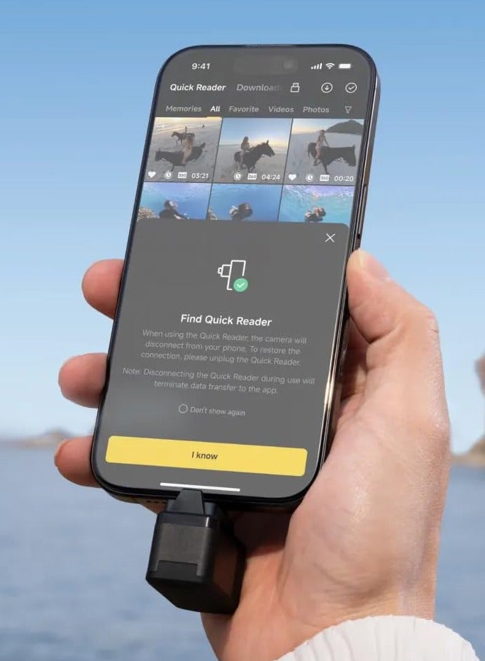 The Insta360 X5 Quick Reader is a compact, dual-interface storage accessory designed to streamline your media workflow. It features both USB-C and Lightning connectors, allowing for fast and direct transfers between your Insta360 X5 camera and a wide range of devices, including Android phones, iPhones, tablets, and computers. This enables you to offload footage without using Wi-Fi or draining your camera battery. The Quick Reader supports real-time playback, editing, and exporting via the Insta360 app, making it easy to manage high-resolution content such as 8K or 5.7K videos. It includes a microSD card slot and supports high-speed UHS-I cards, ensuring reliable and quick file handling. Its plug-and-play design eliminates the need for additional software or cables, offering a convenient and efficient solution for creators who need to manage large video files on the go.