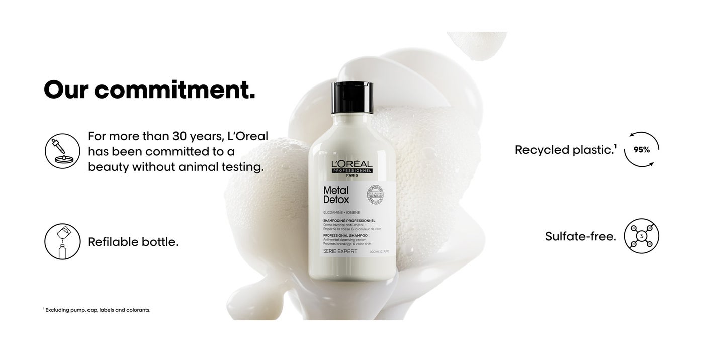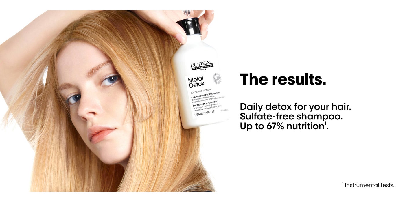 The anti-metal cleansing cream shampoo gently removes metal particles from hair to prevent hair breakage & color shift. A patented technology, enriched with Glicoamine, a molecule small enough to track and neutralize metal inside the fiber.
