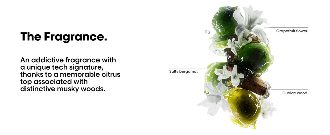 An addictive fragrance with a unique tech signature, thanks to a memorable citrus top associated with distinctive musky woods.