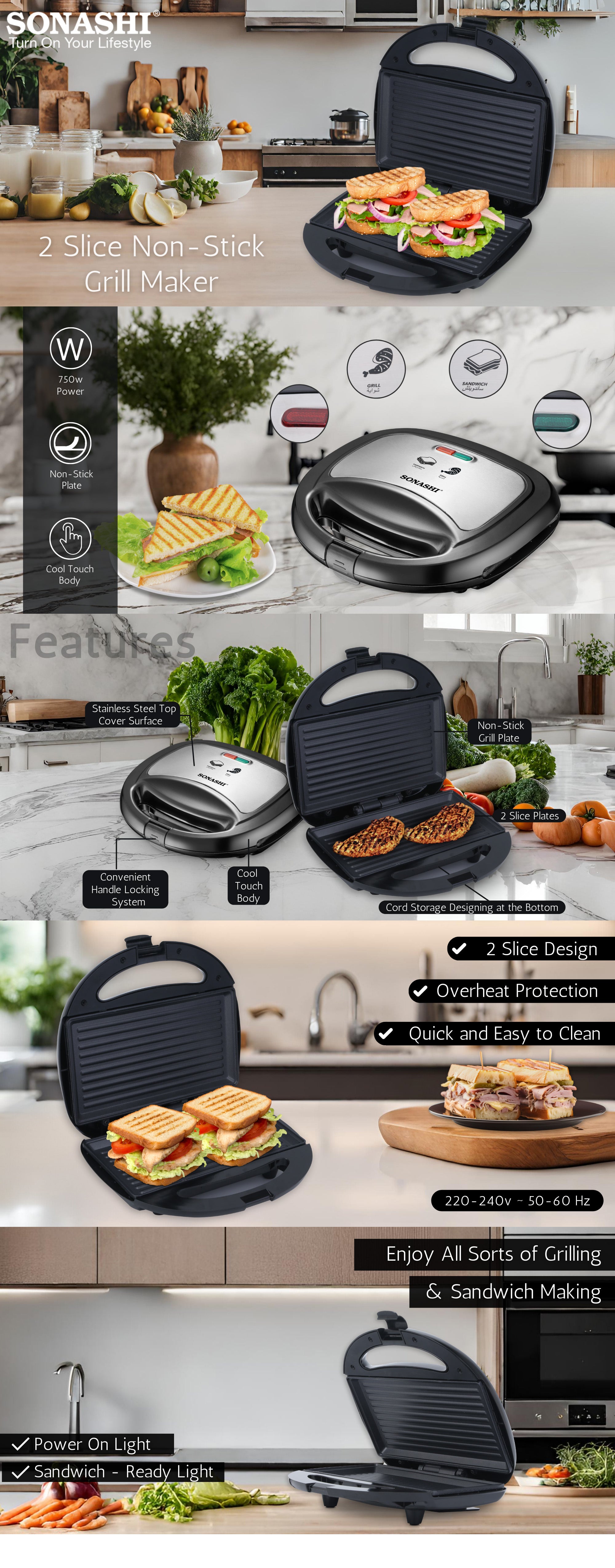 صانع شطائر الإفطار: مع ماكينة صنع الساندوتشات من سوناشي، يمكنك الاستمتاع بالسندويشات المشوية المقرمشة والبنية في منزلك مثل تلك التي تجدها في المقاهي. يعمل بقوة 750 واط ويساعد في طهي المكونات بالداخل.