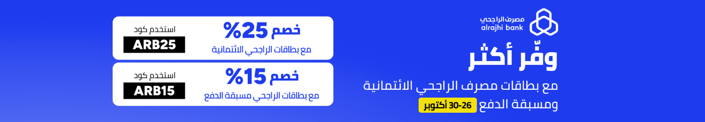 يُطبَّق الخصم عند الدفع باستخدام بطاقات مصرف الراجحي الائتمانية باستخدام الكود: ARB25 أو البطاقات مسبقة الدفع باستخدام الكود: ARB15 الصادرة في المملكة العربية السعودية.