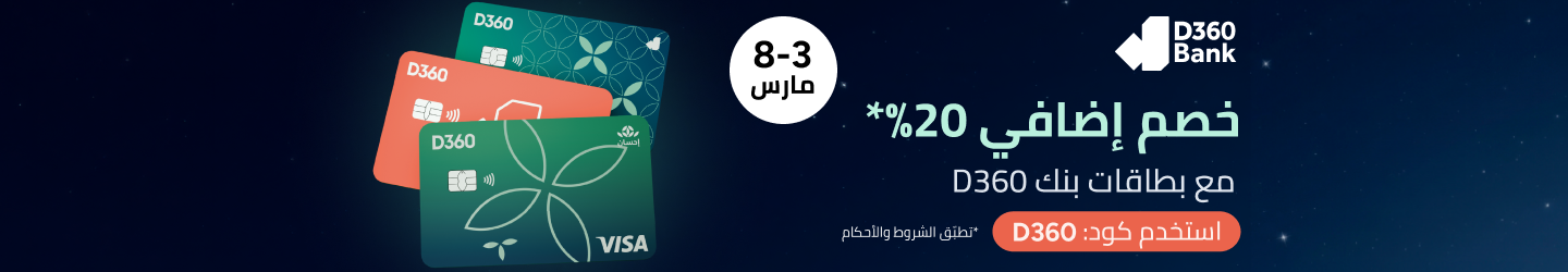 يطبّق العرض تلقائيًا عند الدفع باستخدام بطاقات بنك D360 الصادرة في السعودية من خلال استخدام كود: D360.