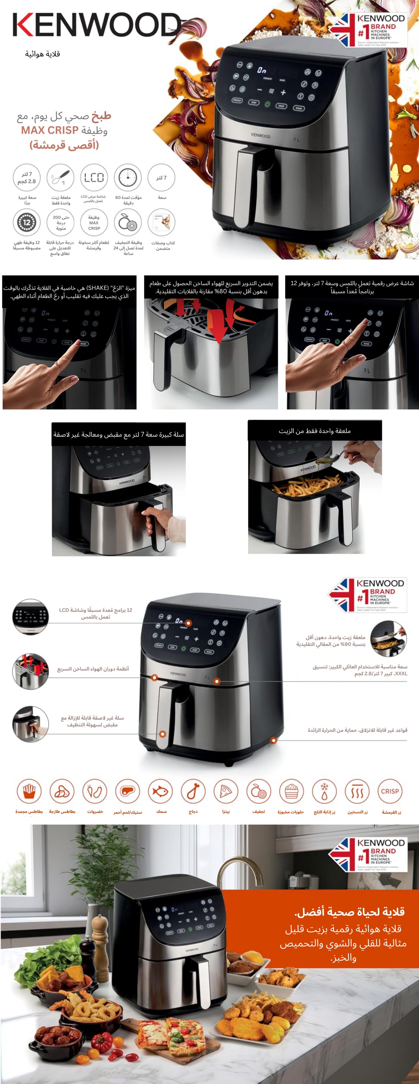 استمتع بطريقة طهي صحية ومريحة للوجبات العائلية مع مقلاة كينوود الهوائية الرقمية XXXL (HFM80.000SS)، التي تتميز بسعة كبيرة تبلغ 7 لترات وتتسع لما يصل إلى 2.8 كجم من الطعام. باستخدام تقنية دوران الهواء الساخن السريع ومحرك قوي بقدرة 1800 واط، يتيح لك هذا الجهاز متعدد الوظائف القلي والشوي والتحميص والخبز وحتى التجفيف باستخدام دهون أقل بنسبة تصل إلى 80% من القلي العميق التقليدي، دون التضحية بالمذاق الرائع. تضمن وظيفة "ماكس كريسـب" (Max Crisp) المبتكرة أن تكون أطباقك مقرمشة تمامًا من الخارج وطرية من الداخل في دقائق معدودة، بينما تجعل شاشة اللمس الرقمية سهلة الاستخدام المزودة بـ 12 برنامجًا مُعدًا مسبقًا إعداد الوجبات أمرًا يسيرًا. مع ميزات عملية مثل تذكير "الرج" لضمان طهي متساوٍ والسلة غير اللاصقة سهلة التنظيف، تعد كينوود HFM80.000SS إضافة أساسية لأي مطبخ عصري، حيث تقدم نتائج لذيذة ونمط حياة أكثر صحة.