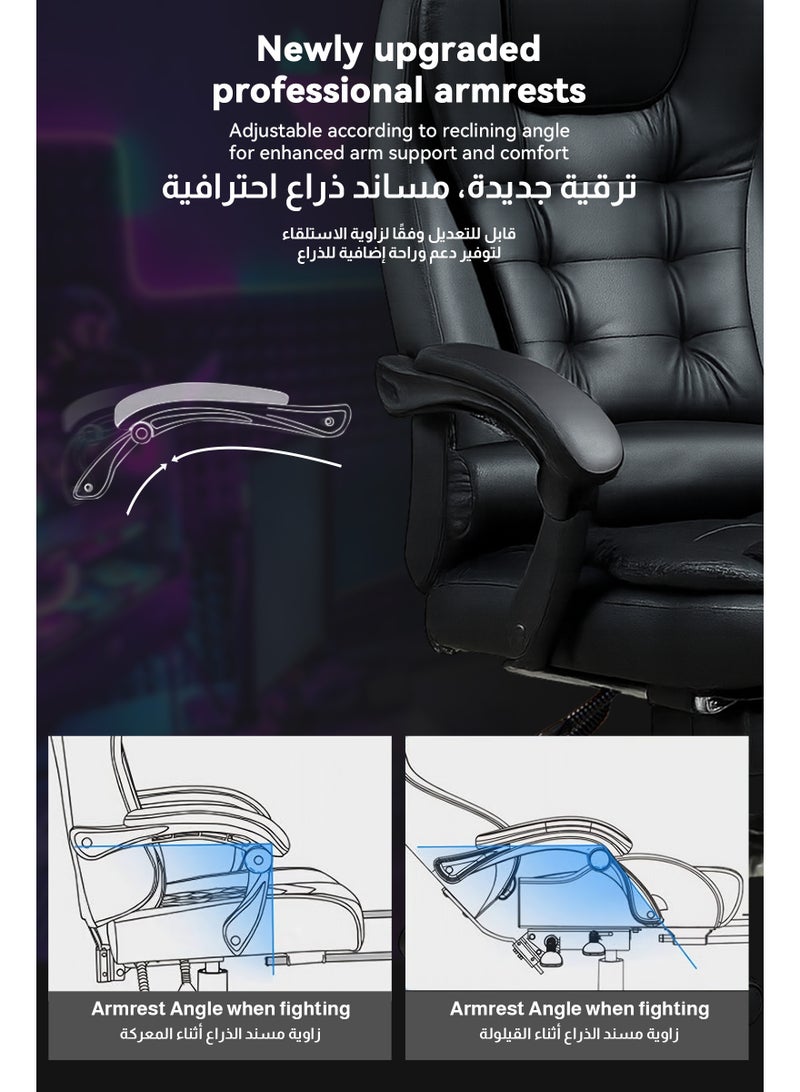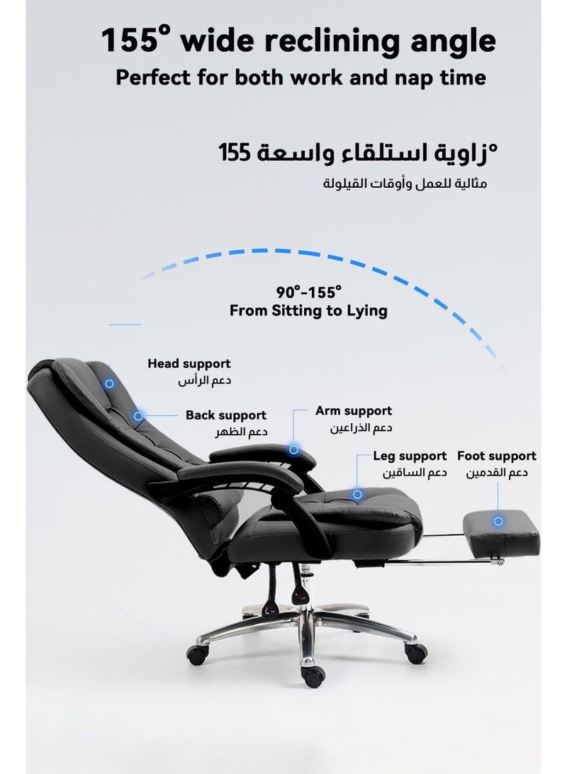 ✅ زاوية إمالة ١٥٥ درجة ومسند قدم مخفي - يتحول فورًا إلى كرسي متكئ، يوفر دعمًا لعضلات الساق وراحةً أثناء القيلولة في المكتب. ✅ دعم مريح للظهر - مسند ظهر مبطن مزدوج الطبقات + وسادة إسفنجية عالية الكثافة لجلوس مريح وتقليل ضغط العمود الفقري.