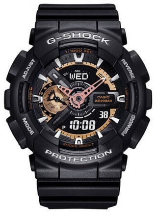 من سلسلة ساعات كاسيو جي شوك الرجالية ذات الهيكل الكبير، المشهورة بتصميماتها الرائعة والمتينة، يتميز هذا الطراز بلمسة من الذهب الوردي. ميناء ساعة جي شوك الرجالية والقرص الداخلي مزينان بالذهب الوردي الأنيق لإضفاء لمسة نهائية أنيقة. استُخدمت شاشة LCD سوداء مقلوبة لتصميم يبرز اللون الذهبي، لإضفاء لمسة نهائية أنيقة.