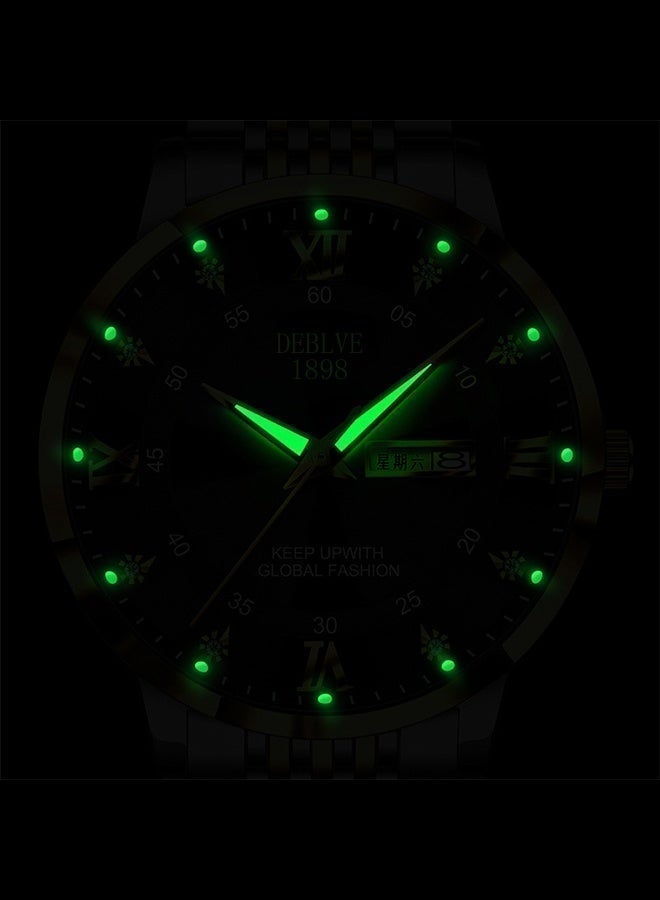 تعمل الساعة الرجالية الفاخرة بحركة كوارتز دقيقة مع عرض اليوم والتاريخ، وعقارب مضيئة لسهولة القراءة في جميع الأوقات. يوفر السوار القابل للتعديل راحة مثالية للاستخدام اليومي.