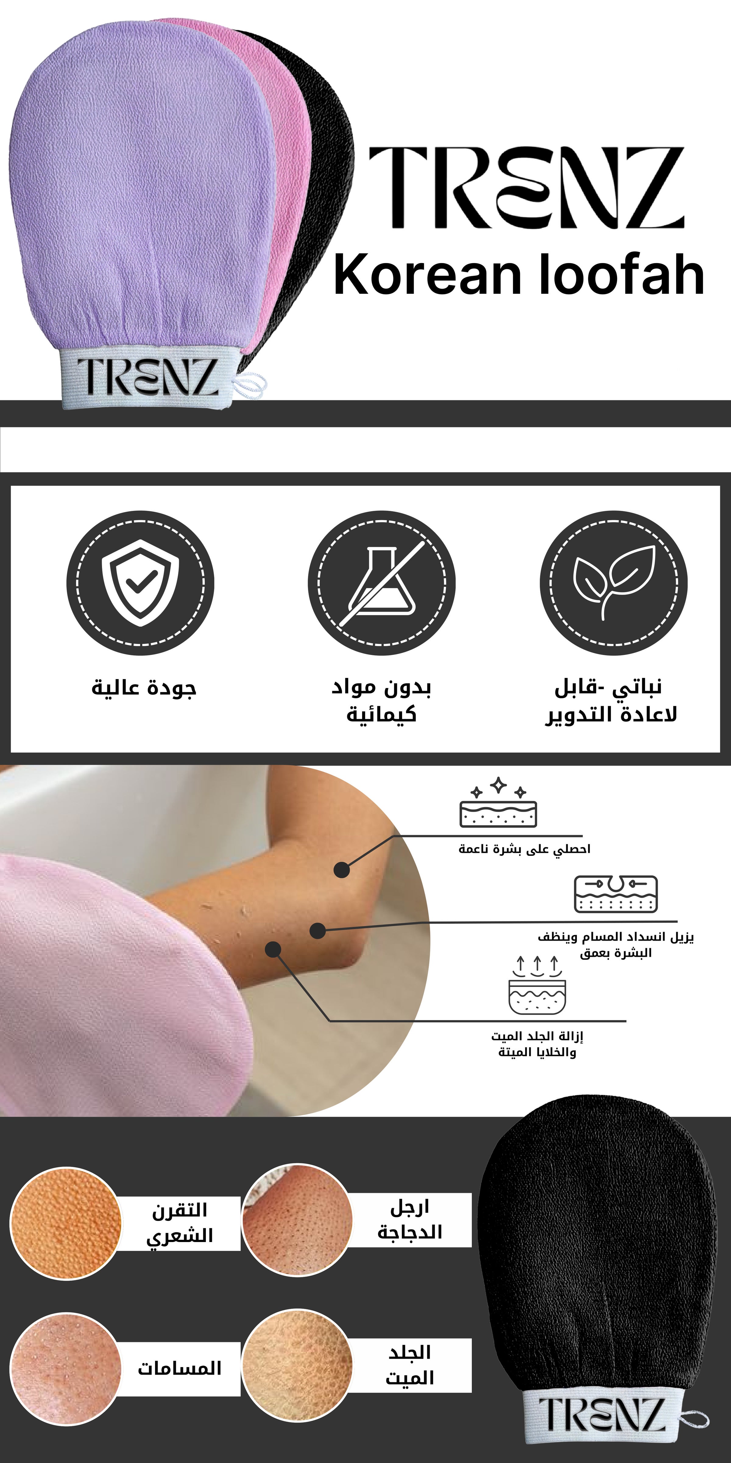 تحتاج البشرة للتنظيف المستمر وإزالة الجلد الميت للحفاظ على نضارتها وشبابها. الليفة الكورية من ترنز، المصنوعة من الفيسكوز (ألياف نباتية طبيعية)، هي الحل الأمثل لتحقيق ذلك دون الحاجة للذهاب إلى صالونات التجميل أو الحمامات المغربية. تعمل هذه الليفة الفعّالة على تقشير البشرة بلطف، وإزالة خلايا الجلد الميتة، والحفاظ على توهج وشباب بشرة الجسم. بالإضافة إلى ذلك، فهي تساعد في تنظيف الجسم بعمق والتخلص من الأوساخ، الندوب، والآثار غير المرغوبة.