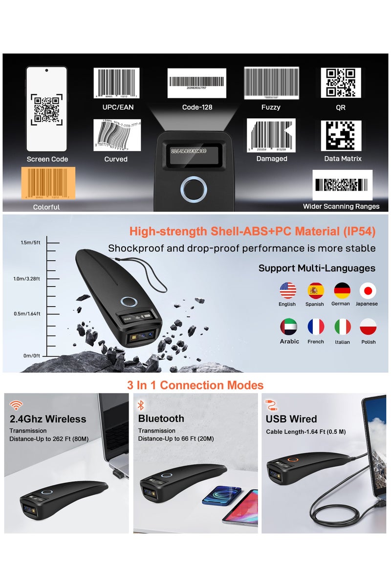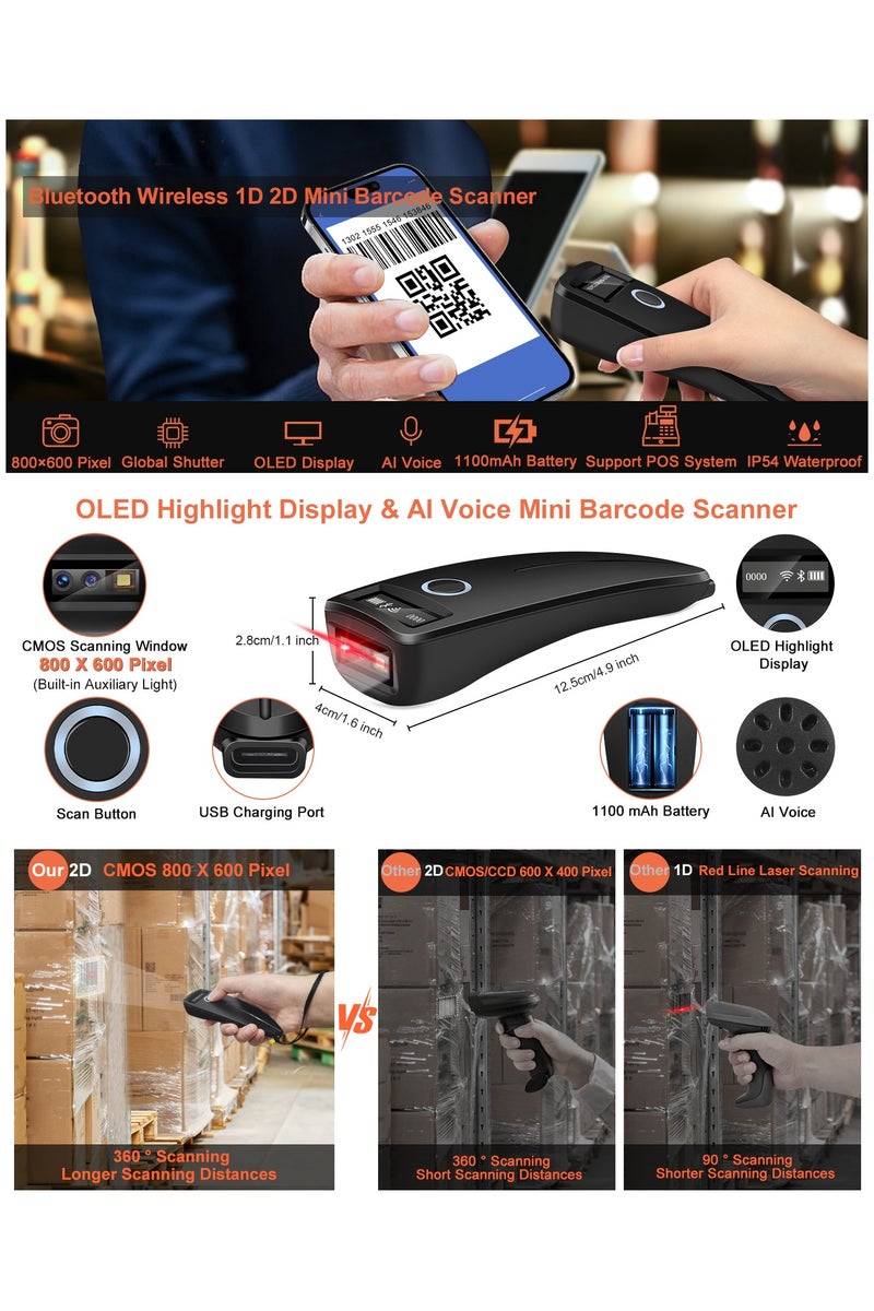 OLED Digital Display: Compared with the traditional mini barcode scanners on the market, W7 Mini Bar code scanner adds the OLED Digital Screen to display the Wireless, Bluetooth, Battery, Scanning and Storage Status for easier and more intuitive operation.