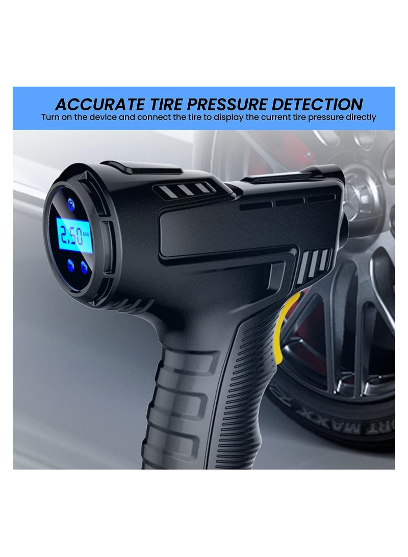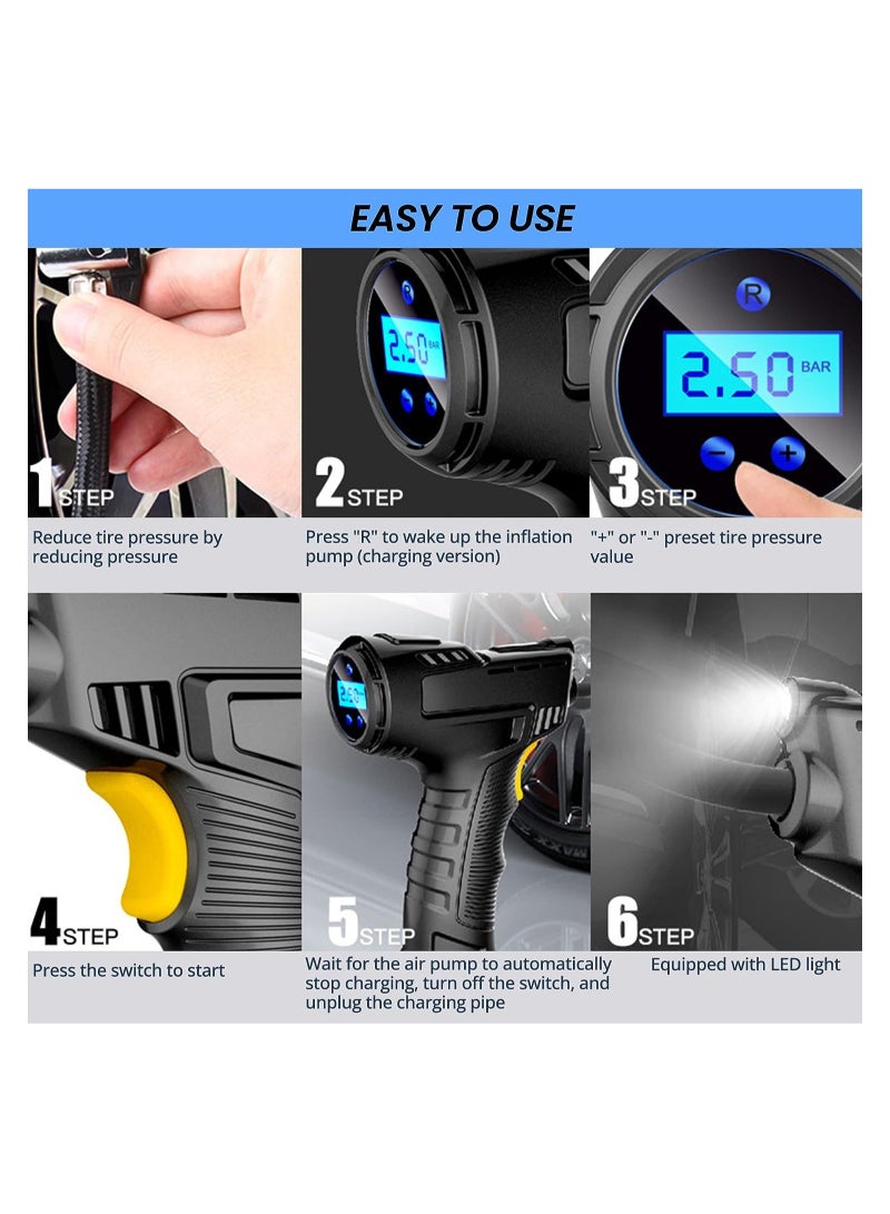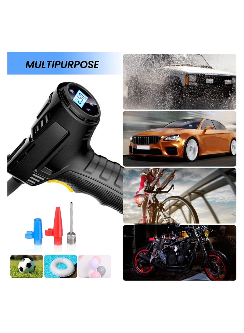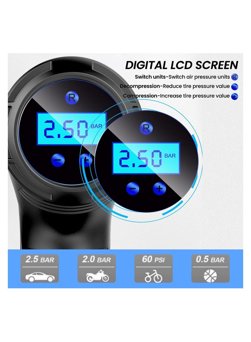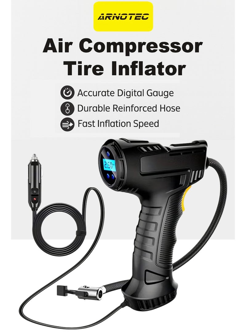This 12V air compressor features a clear digital display that shows real-time tire pressure, helping you maintain optimal air levels for improved fuel efficiency and tire life. Simply set your desired pressure, connect the air hose, and let the inflator do the rest—the device automatically stops when the target pressure is reached.