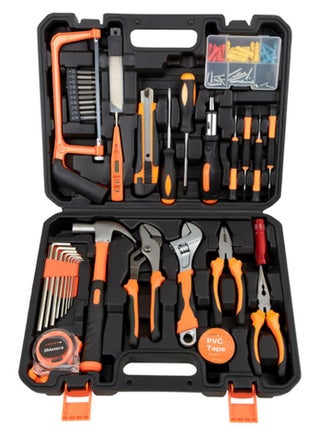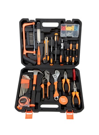 طقم أدوات متينة 100 قطعة مع حقيبة - مجموعة أدوات يدوية قوية تضم منشار، مفكات، مفاتيح ربط، كماشات، مفاتيح سداسية، شريط قياس 3 متر، مثالي لأعمال الصيانة المنزلية، التجميع، الأعمال الكهربائية، النجارة، وورش العمل. أسود/برتقالي/فضي