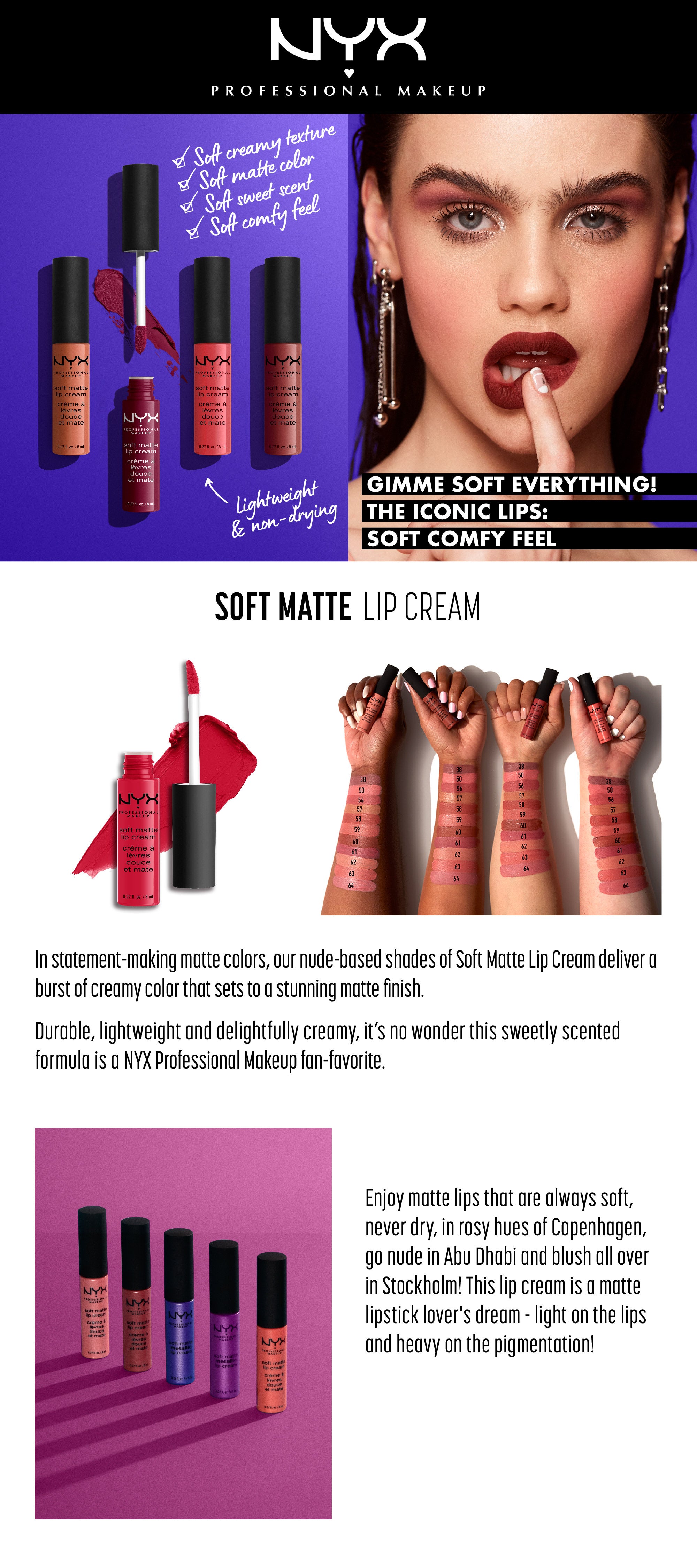 اصنعي الحدث بشفاه غير لامعة، حيث يوفر أحمر الشفاه الكريمي الناعم غير اللامع ذات التركيبة الغنية الفاخرة مجموعة من الألوان الكريمية التي تضفي لمسة نهائية غير لامعة مذهلة. أحمر شفاه ذو قوام كريمي خفيف الوزن ومبهج ويدوم طويلًا، فلا عجب في أن هذه التركيبة ذات الرائحة العذبة هي المفضلة لدى محبي إن واي إكس بروفيشنال ميكاب. غلفي شفتيكِ بهذه التركيبة غير اللامعة ذات الصبغات العالية والفاخرة بألوان مستوحاة من مدن العالم. تمتعي بالشفاه غير اللامعة والتي تكون دائمًا ناعمة، لا تجف أبدًا، بدرجات ألوان وردية في كوبنهاغن، وانطلقي إلى أبو ظبي وأحمر الخدود في كل مكان في ستوكهولم! كريم الشفاه هذا هو حلم محبي أحمر الشفاه غير اللامع - خفيف على الشفاه وذو صبغة مكثفة!