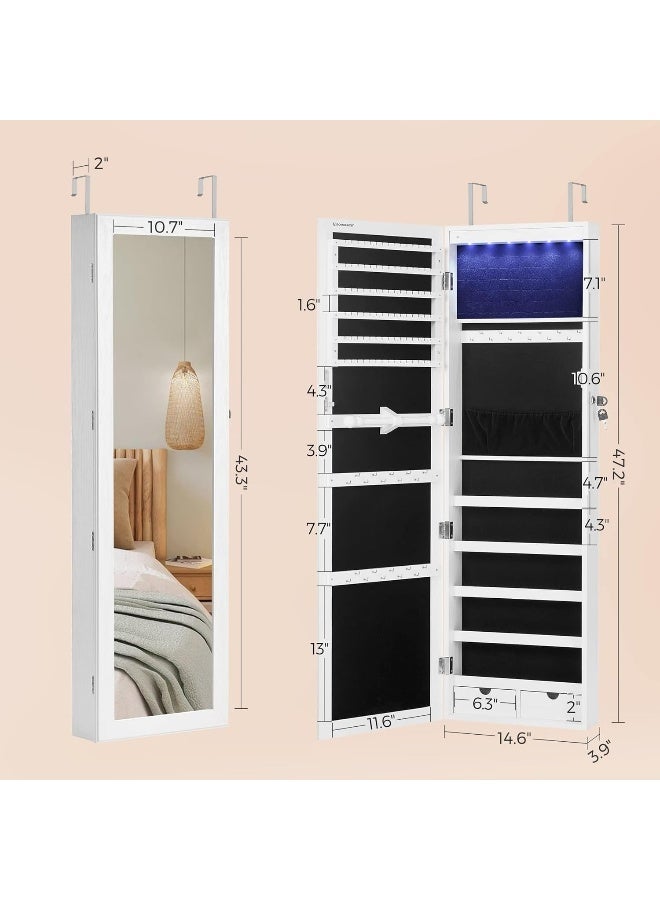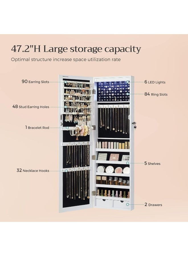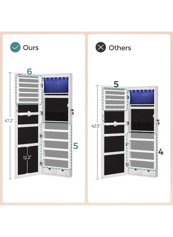 خزانة مجوهرات SONGMICS مزودة بمرآة و6 مصابيح LED، ارتفاعها 47.2 بوصة، قابلة للقفل، تُثبت على الحائط أو الباب، لون أبيض
