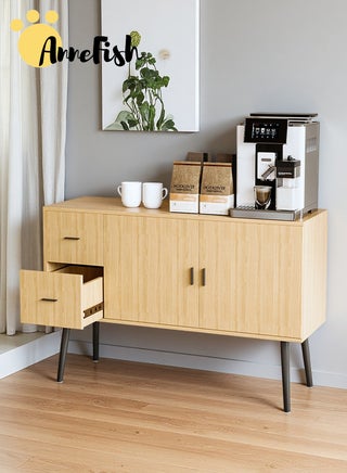 [Storage area]: The large countertop area is matched with the lower open cabinets and drawers. The super storage capacity is very suitable for the office or the coffee corner at home.[Clear partitions]: The countertop is used to store common items such as coffee machines, kettles, etc. The lower part of the open cabinet can prevent coffee beans, magazines, etc., and the drawer can store some reserve items., [Smooth corners]: We have carefully designed smooth corners at the corners that are easy to bump, which can effectively reduce the damage of impact, and you no longer have to worry about being injured due to bumps., [Distance from the ground]: The distance from the ground of 30cm provides considerable convenience for your cleaning work. The robot vacuum can easily get in and out, and you don't have to bend over to clean if you need a broom, [High-quality material]: High-quality beech wood table legs and MDF are used to ensure the appearance, and the overall load-bearing capacity and stability of the coffee cabinet are excellent, you can use it with confidence