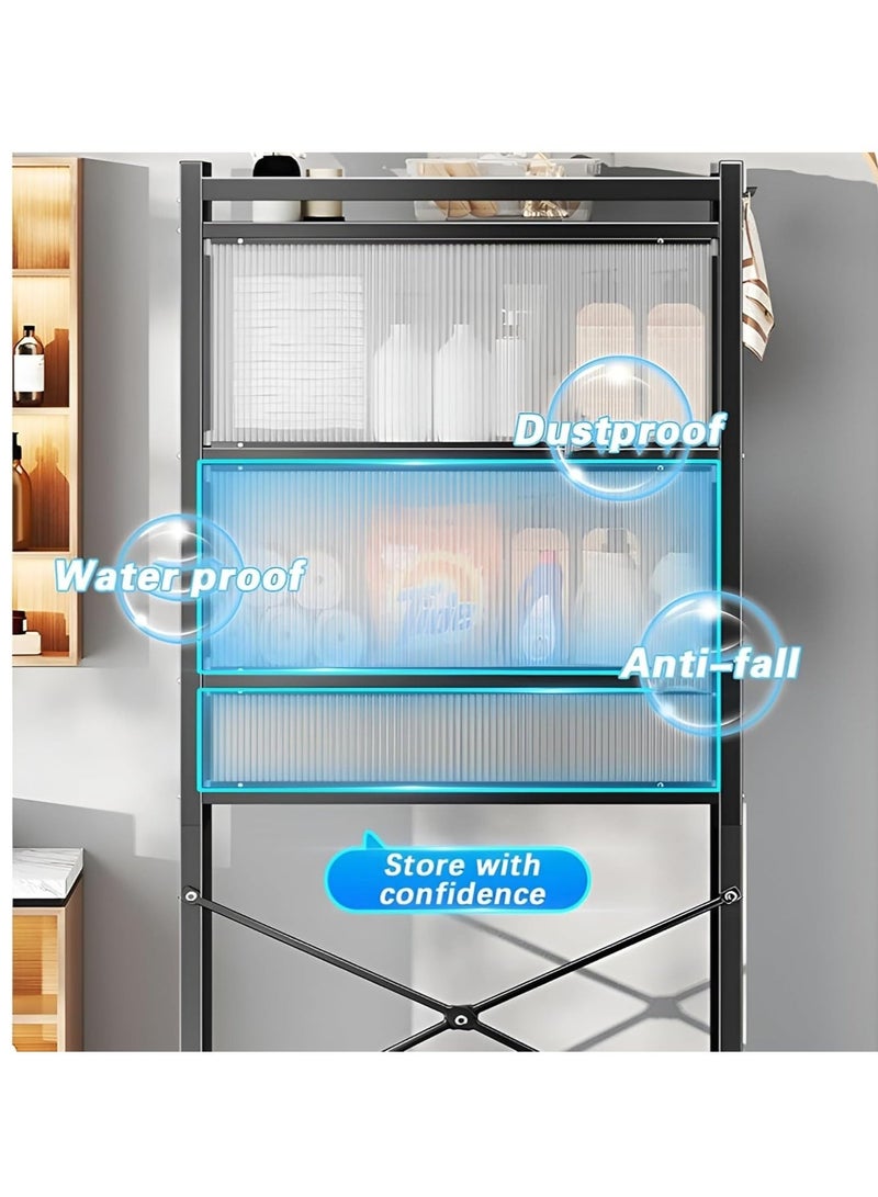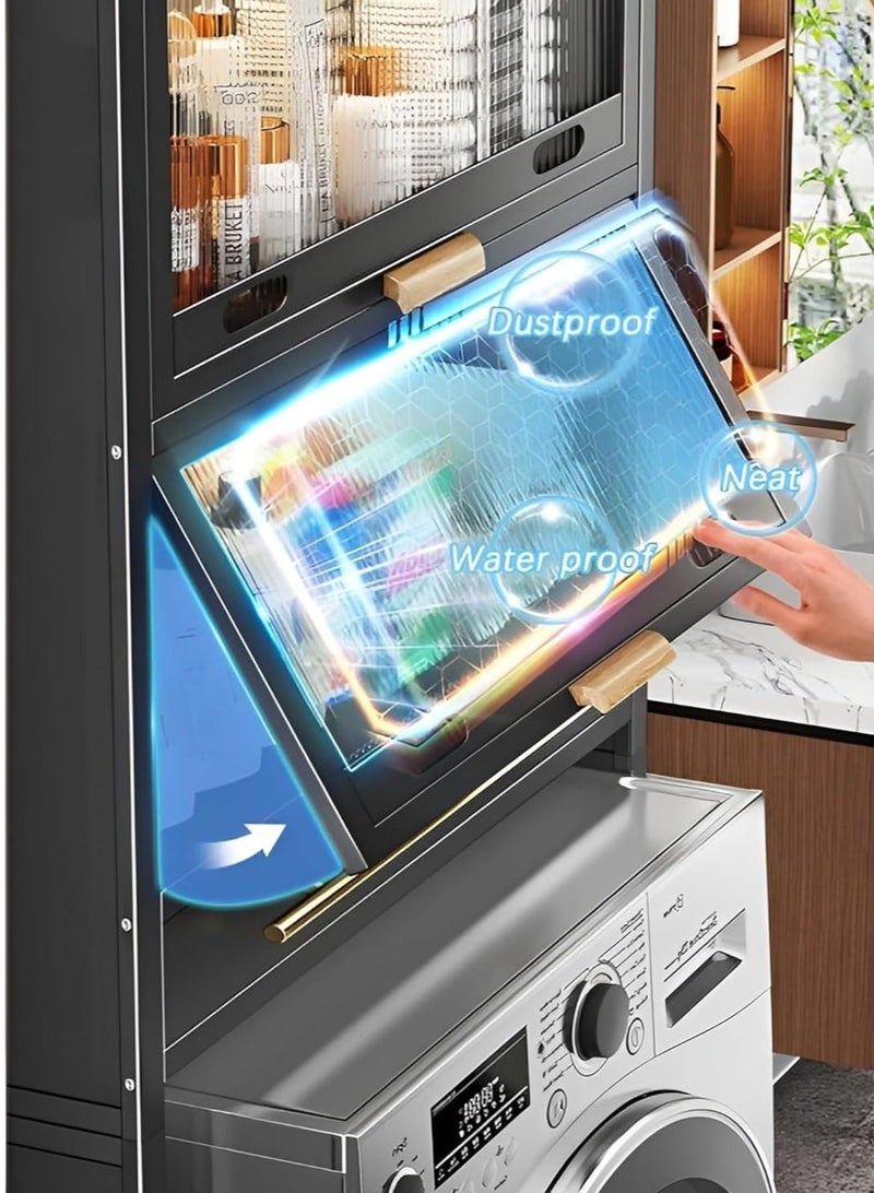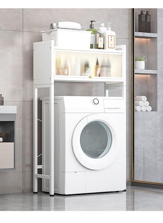 Featuring a thoughtfully designed configuration, this rack boasts generous space to accommodate all your laundry essentials, from detergents and fabric softeners to towels and cleaning supplies. With a convenient open shelf at the top and a cabinet adorned with stylish acrylic plate doors, organizing and accessing your supplies has never been easier or more convenient.
