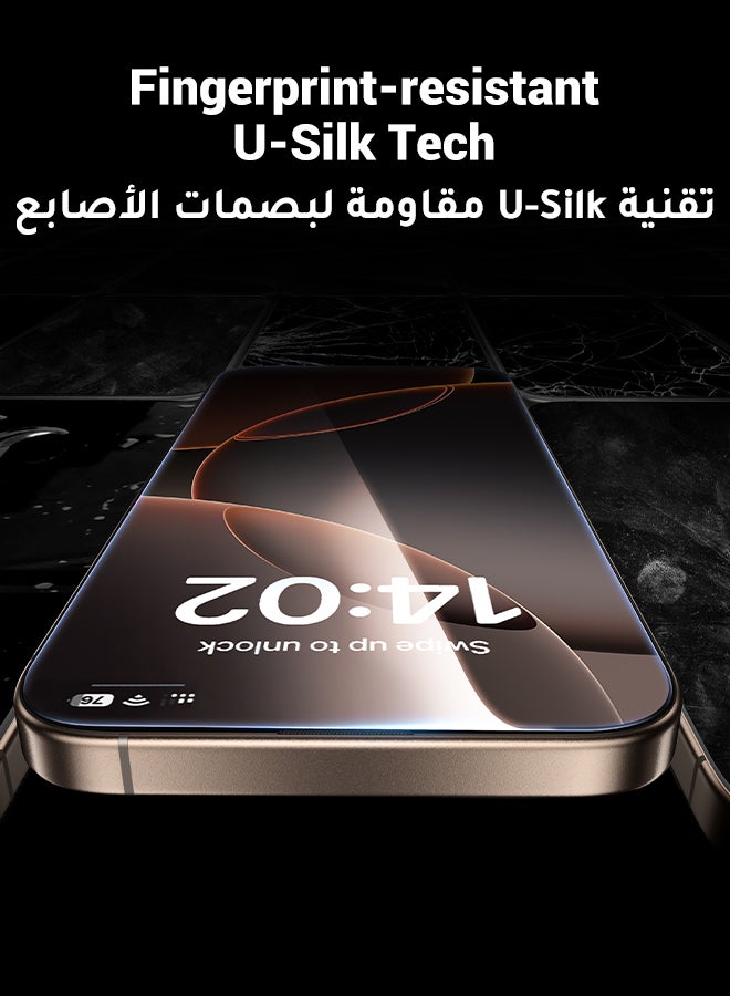 【Anti-Fingerprint & Anti-Smudges】With the newest U-Silk oleophobic coating tech, the iPhone 16 Pro Max Glass Protector will effectively reduce fingerprints and smudges, making the screen very easy to clean.