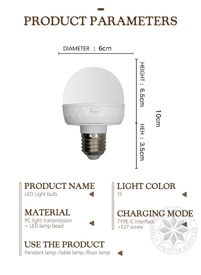 This E26 rechargeable LED bulb features multiple mounting options, including a detachable magnetic base, hook, and 3M adhesive, offering flexible installation. With 15 RGB colors, 3 color temperatures, and 10 dimmable brightness levels, it provides customizable lighting for any setting. Equipped with a 30/60/120-minute timer and a 2000mAh battery, it offers up to 10 hours of use on a full charge. Ideal for emergency lighting during power outages, it's perfect for both indoor and outdoor use.