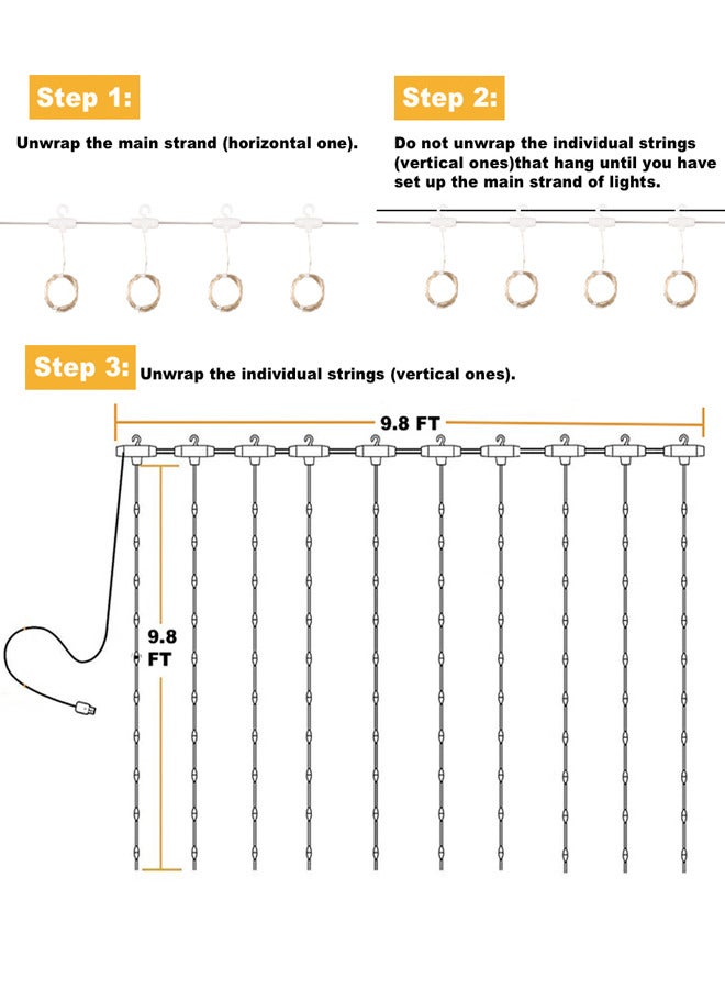 【16.5ft Lead wire】: 300 individual LEDs, 9.8ft.x9.8ft curtains lights come with extra 16.5ft long power cord. 9.8ft main strand and 10 drop strings included hooks. Copper wire drop strings is tough & flexible, hanging & adjustable desired height natu