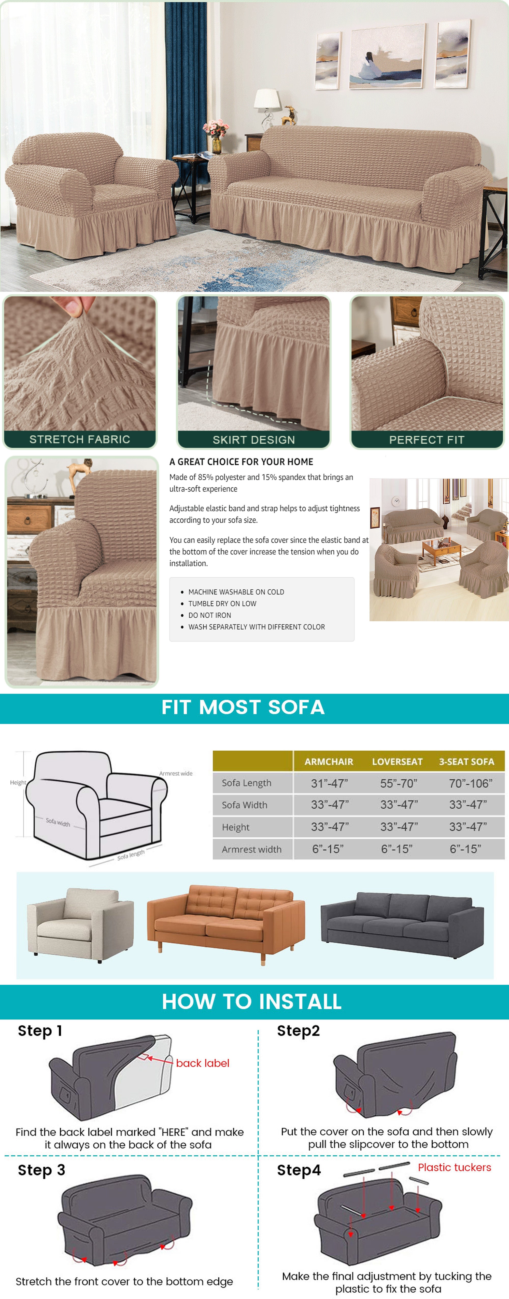 Our sofa covers is very easy to install and requires no thought at all. we also offer fixed rollers, which can be tucked into the gaps to make the fabric more tight. And the elasticized bottom helps the slipcover stay in place firmly.