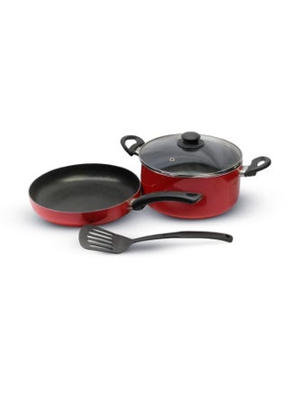Effortless cooking at your fingertips. The Delcasa 4-piece aluminum nonstick set is a very durable, strong, and easy-to-clean set that is an excellent addition to your collection. Designed with high-quality aluminum and a durable double-layered non-stick coating, this set distributes heat evenly while cooking. The set includes a 24 cm casserole with lid, a 26 cm frypan, and a nylon turner, so you can easily prepare a variety of dishes. They are made of sturdy aluminum with a non-toxic, non-stick coating, and they have a flat bottom for efficient cooking. With the non-stick coating, you can enjoy long-lasting cooking with minimal oil or ghee. The high heat retention capacity and durability enable years of healthy cooking. The set features a heat-resistant Bakelite handle with a soft touch that offers safety, making them easy to use for beginners. The pan has a top-quality nonstick coating that ensures easy food release and easy cleanup. This set is a good choice for you and your family because it is versatile and has a wide range of uses. The frypan is suitable for shallow frying, deep frying, sauting, searing, tempering, etc. The set also includes a casserole, which is appropriate for making sauces, soups, or tasks like stewing, simmering, and boiling water. The frypan is suitable for preparing eggs, fish fries, chicken fries, pancakes, and toasting bread. In addition, the nylon turner is most suitable for flipping and transferring food without damaging the non-stick coating. Its robust body and utility features make it convenient to use. This set is compatible with hot plates on halogen, ceramic, and gas cooktops. It offers hassle-free cooking with easy cleaning and low maintenance. It features a modern design, a stylish red color, and long-lasting durability, making it a thoughtful gift option. Prepare healthy and tasty meals with this stylish aluminum non-stick cookware set. The set weighs only 1.913 kg. '